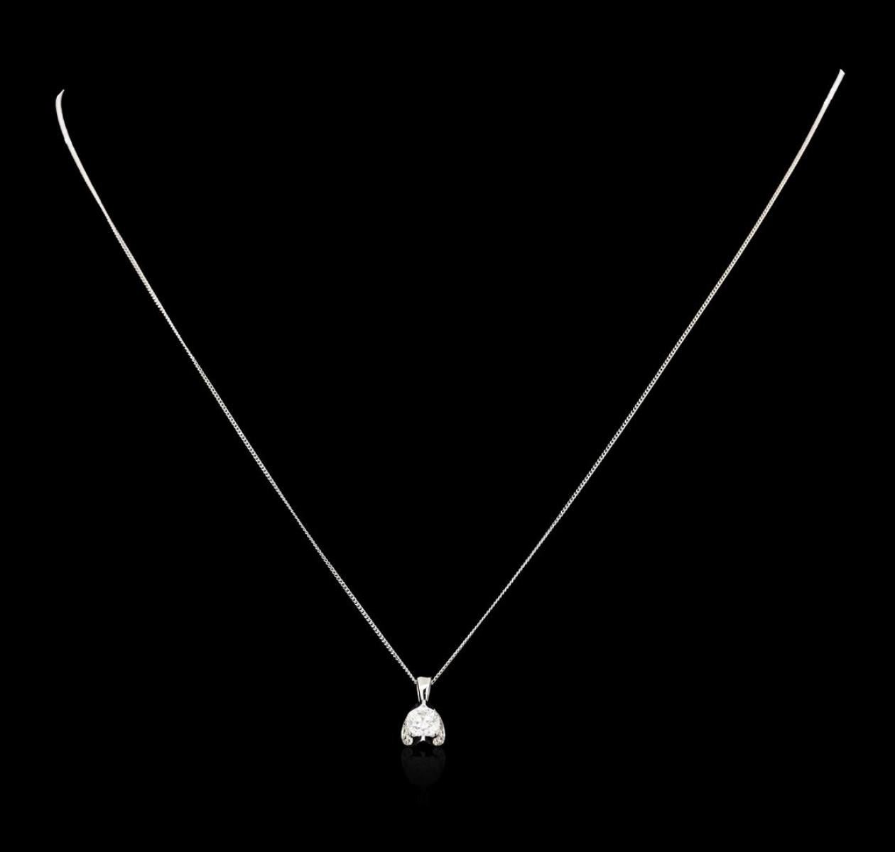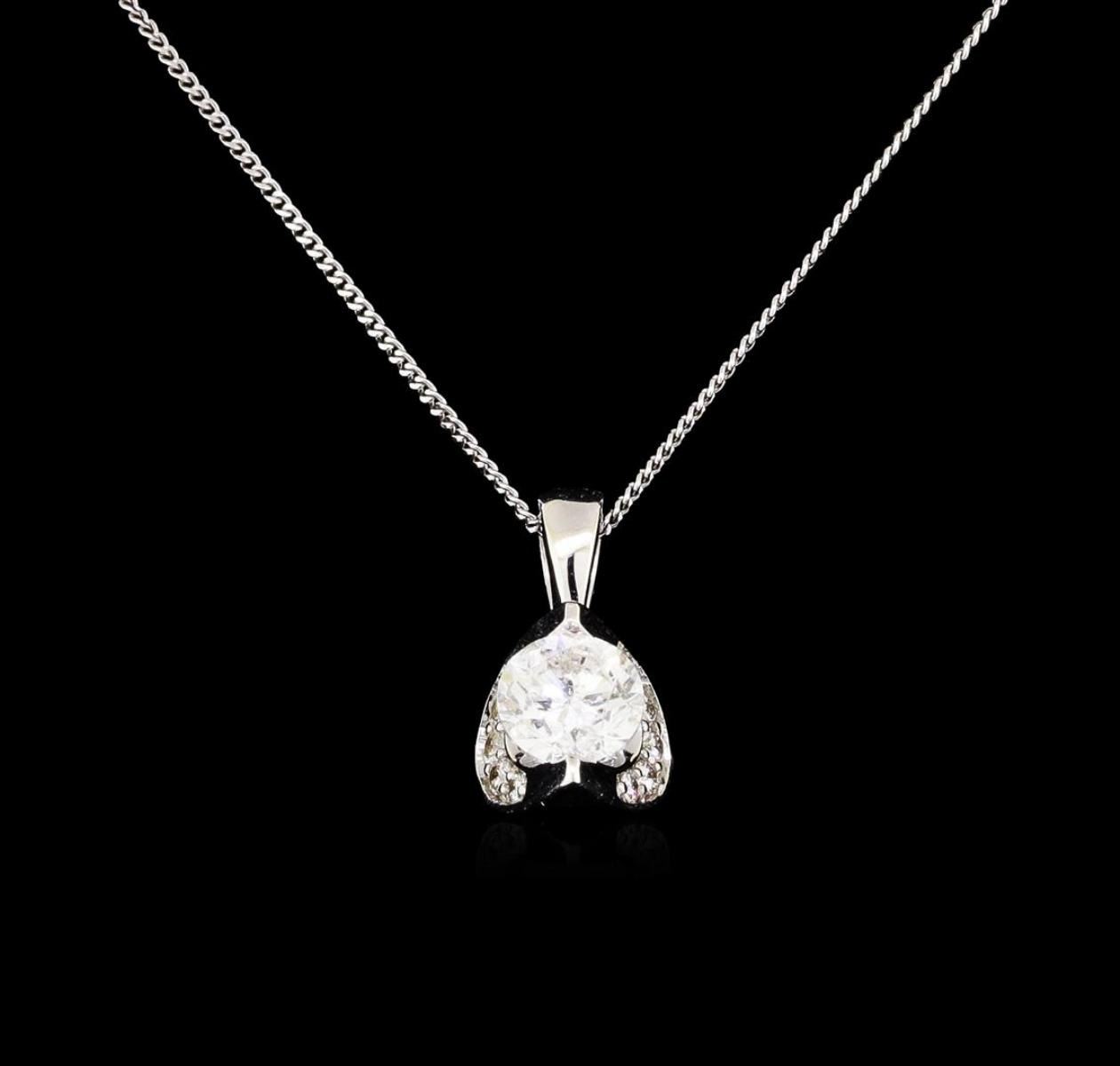 One electronically tested 14KT white gold lady's combination cast & assembled fashion pendant and chain 16.0' long, 1mm cable link with a spring ring clasp with a bright polish finish. Identified with markings of '14K'. Condition is new, good workmanship. Containing: One channel set round brilliant cut diamond, measuring 4.60 - 4.58 x 2.94mm (depth est.) approximate weight of 0.40 ct. The featured center diamond is Canadian. Graded in the setting in the GGI Laboratory, report number CD 7-919384. Color F Clarity I-2 Cut Very Good Ten prong set round brilliant cut diamonds, measuring 1.40 - 1.30 x 0.84mm (depth est.) approximate total weight of 10 Stones = 0.10 ct. Graded in the setting. Color G - H Clarity SI-1 to I-1 Cut Good. Total Weight of Diamonds 0.50 ct.. Total Weight of Pendant And Chain 1.60gm GAS Appraised at $1675.00. GAS Appraised.