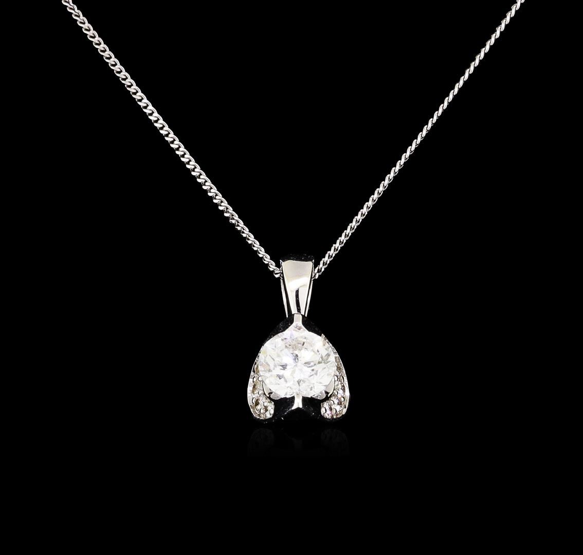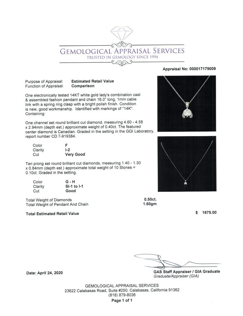 One electronically tested 14KT white gold lady's combination cast & assembled fashion pendant and chain 16.0' long, 1mm cable link with a spring ring clasp with a bright polish finish. Identified with markings of '14K'. Condition is new, good workmanship. Containing: One channel set round brilliant cut diamond, measuring 4.60 - 4.58 x 2.94mm (depth est.) approximate weight of 0.40 ct. The featured center diamond is Canadian. Graded in the setting in the GGI Laboratory, report number CD 7-919384. Color F Clarity I-2 Cut Very Good Ten prong set round brilliant cut diamonds, measuring 1.40 - 1.30 x 0.84mm (depth est.) approximate total weight of 10 Stones = 0.10 ct. Graded in the setting. Color G - H Clarity SI-1 to I-1 Cut Good. Total Weight of Diamonds 0.50 ct.. Total Weight of Pendant And Chain 1.60gm GAS Appraised at $1675.00. GAS Appraised.