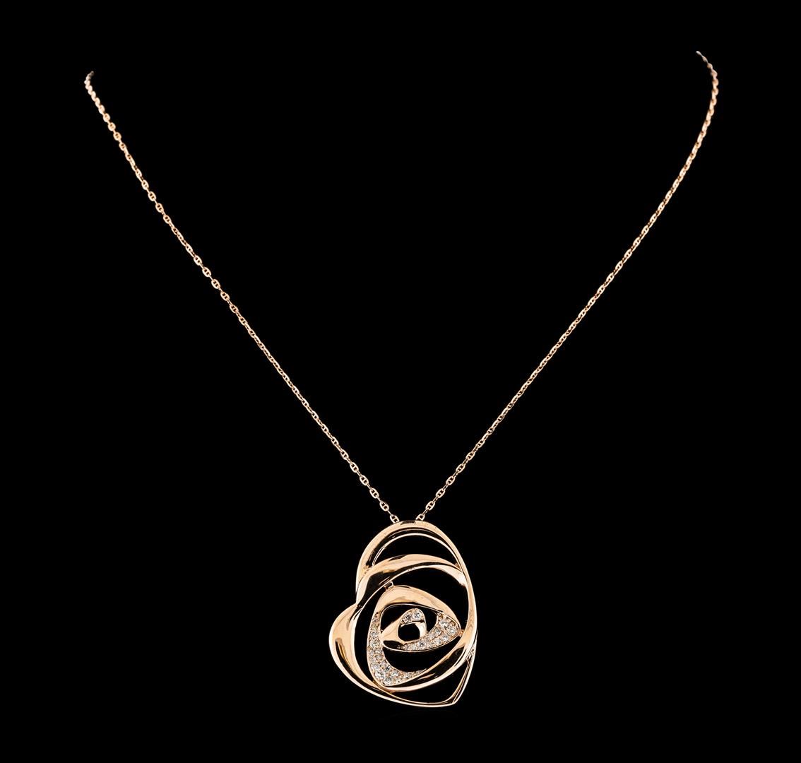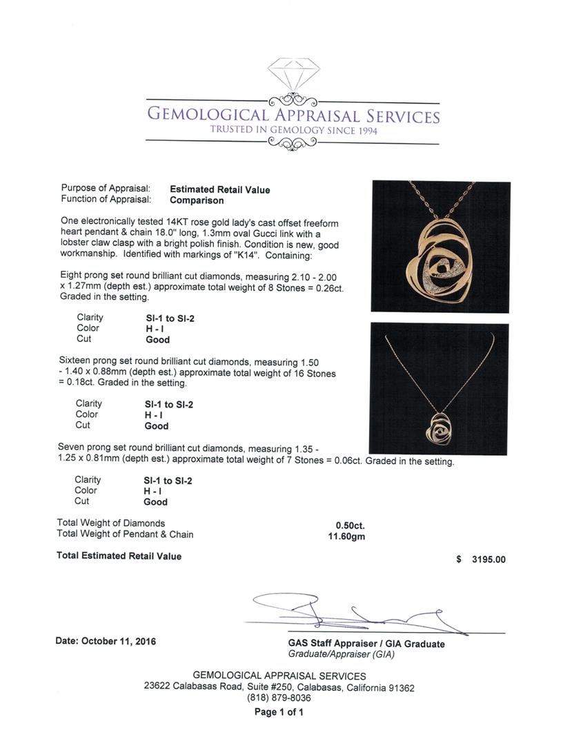 One electronically tested 14KT rose gold lady's cast offset freeform heart pendant & chain 18.0' long, 1.3mm oval Gucci link with a lobster claw clasp with a bright polish finish. Identified with markings of 'K14'. Condition is new, good workmanship. Containing: Eight prong set round brilliant cut diamonds, measuring 2.10 - 2.00 x 1.27mm (depth est.) approximate total weight of 8 Stones = 0.26ct. Graded in the setting. Clarity SI-1 to SI-2. Color: H - I Cut Good Sixteen prong set round brilliant cut diamonds, measuring 1.50 - 1.40 x 0.88mm (depth est.) approximate total weight of 16 Stones = 0.18ct. Graded in the setting. Clarity SI-1 to SI-2. Color: H - I Cut Good Seven prong set round brilliant cut diamonds, measuring 1.35 - 1.25 x 0.81mm (depth est.) approximate total weight of 7 Stones = 0.06ct. Graded in the setting. Clarity SI-1 to SI-2. Color: H - I Cut Good. Total Weight of Diamonds 0.50 ct.. Total Weight of Pendant & Chain 11.60gm. GAS Appraised.