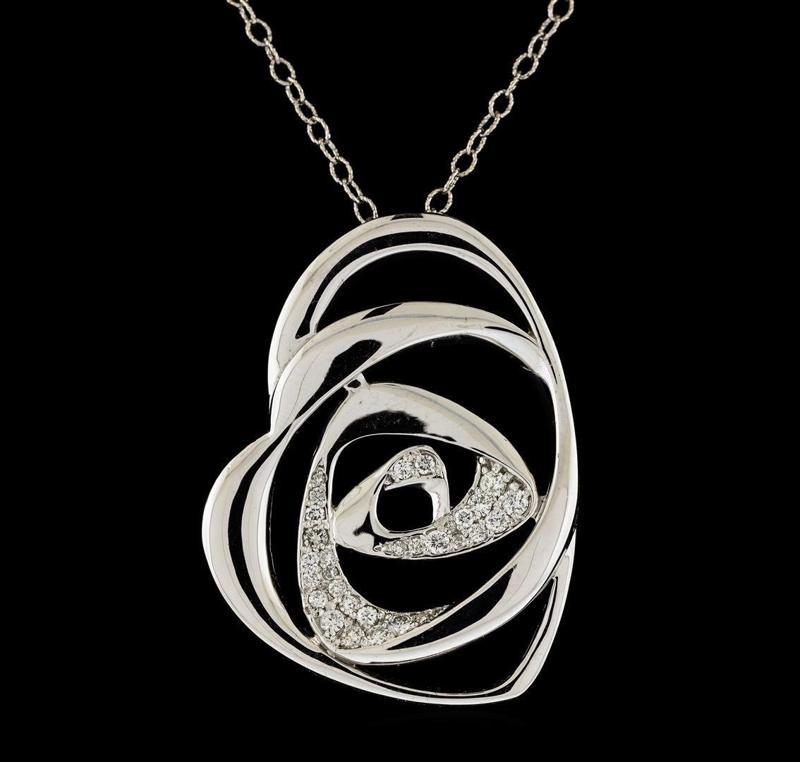 One electronically tested 14KT white gold lady's cast offset freeform heart pendant & chain 18.0' long, 2mm twisted oval shape link with a lobster claw clasp with a bright polish finish. Identified with markings of 'K14'. Condition is new, good workmanship. Containing: Eight prong set round brilliant cut diamonds, measuring 2.10 - 2.00 x 1.27mm (depth est.) approximate total weight of 8 Stones = 0.26ct. Graded in the setting. Clarity SI-1 to SI-2. Color: H - I Cut Good Sixteen prong set round brilliant cut diamonds, measuring 1.50 - 1.40 x 0.88mm (depth est.) approximate total weight of 16 Stones = 0.18ct. Graded in the setting. Clarity SI-1 to SI-2. Color: H - I Cut Good Seven prong set round brilliant cut diamonds, measuring 1.35 - 1.25 x 0.81mm (depth est.) approximate total weight of 7 Stones = 0.06ct. Graded in the setting. Clarity SI-1 to SI-2. Color: H - I Cut Good. Total Weight of Diamonds 0.50 ct.. Total Weight of Pendant & Chain 11.10gm. GAS Appraised.