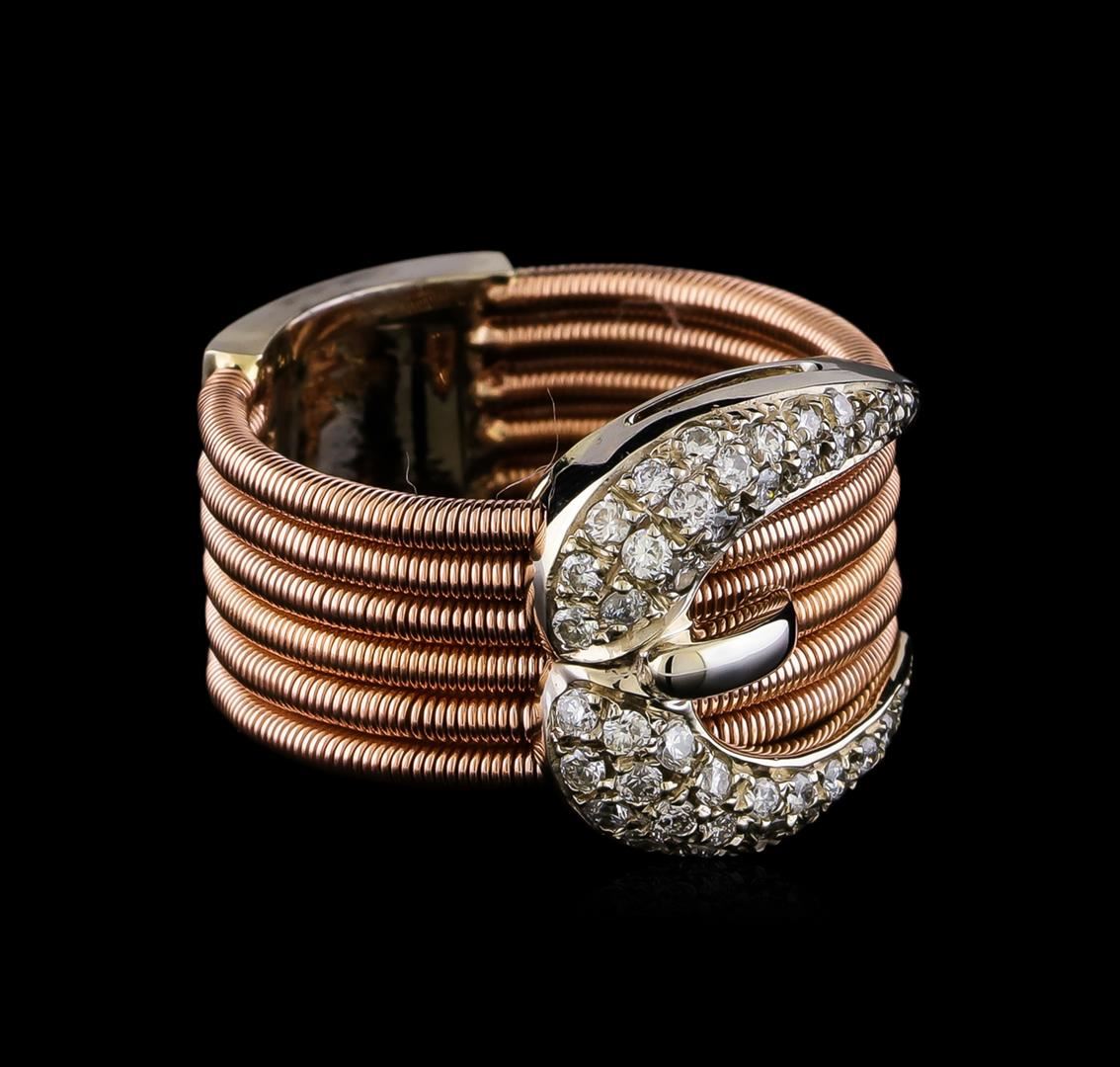 One electronically tested 14KT rose and white gold lady's cast fashion ring with a six row wide band with a bright polish finish. The featured lady's ring has a shank measuring 10.49 millimeters in width. Identified with markings of "K14". Condition is new, good workmanship. Containing: Sixteen prong set round brilliant cut diamonds, measuring 1.65 - 1.60 x 1.01mm (depth est.) approximate total weight of 16 Stones = 0.26ct. Graded in the setting. Clarity: SI-1 to SI-2. Color: H - I. Cut Good Twenty-Four prong set round brilliant cut diamonds, measuring 1.40 - 1.35 x 0.86mm (depth est.) approximate total weight of 24 Stones = 0.24ct. Graded in the setting. Clarity: SI-1 to SI-2. Color: H - I. Cut Good. Total Weight of Diamonds 0.50ct. Total Weight of Ring 12.30gm. GAS Appraised at $3,415.00.