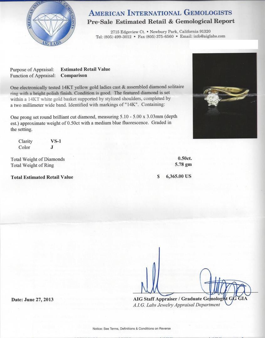 One electronically tested 14KT yellow gold ladies cast & assembled diamond solitaire ring with a bright polish finish. Condition is good. The featured diamond is set within a 14KT white gold basket supported by stylized shoulders, completed by a two millimeter wide band. Identified with markings of "14K". Containing: One prong set round brilliant cut diamond, measuring 5.10 - 5.00 x 3.03mm (depth est.) approximate weight of 0.50ct with a medium blue fluorescence. Graded in the setting. Clarity: VS-1. Color: J. Total Weight of Diamonds: 0.50ct. Total Weight of Ring: 5.78 gm. AIG Appraised at $6,365.00.