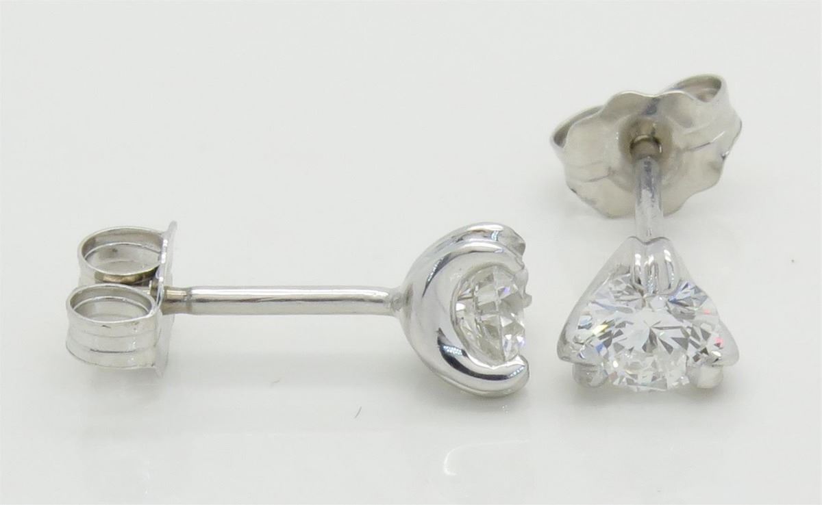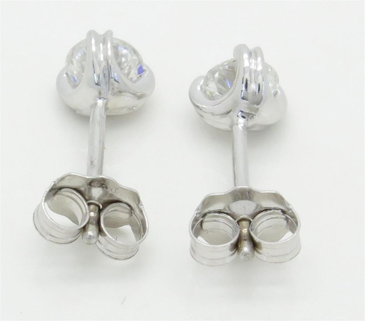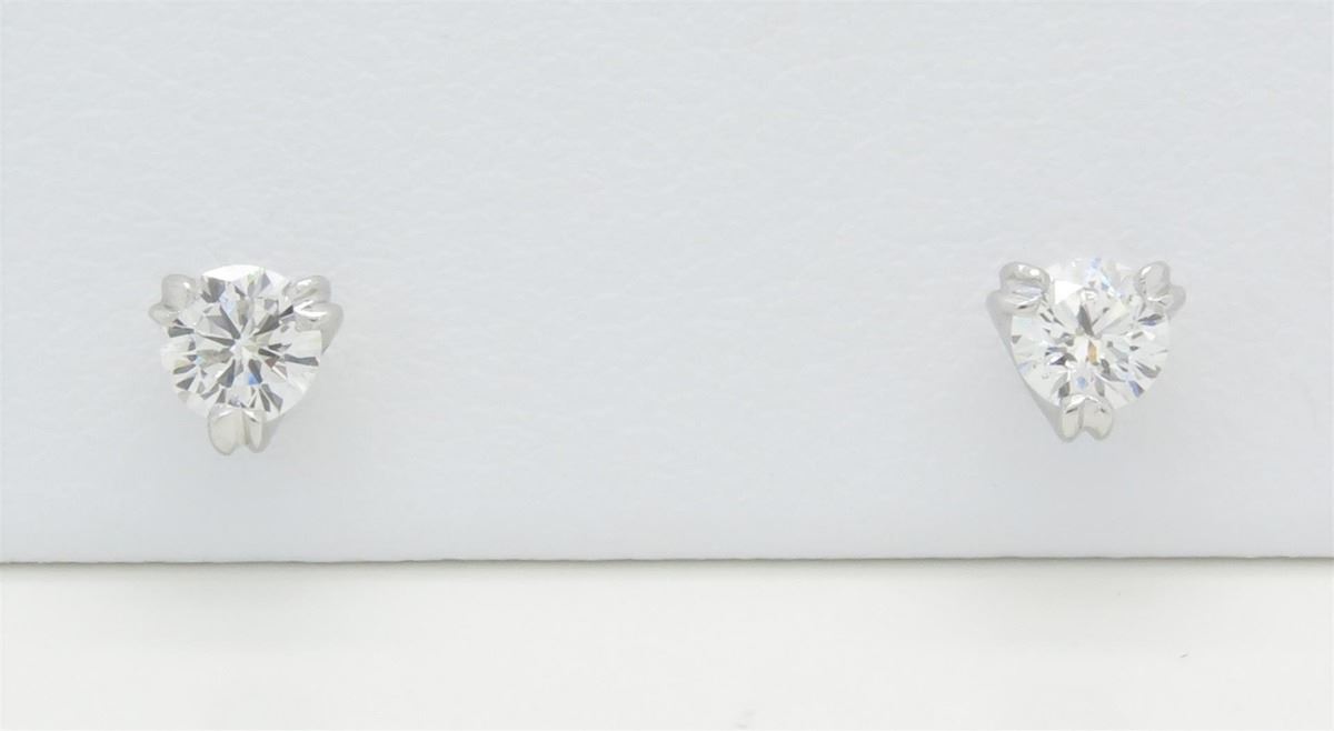 Two tested 14K white gold diamond earrings. Containing: Two Round Brilliant Cut Diamonds. Clarity: SI, Color: F-G. Approximate total diamond weight: .50CTW. Diamonds are graded in the mounting, unless otherwise stated. Weight of earrings: 1.0 gram.