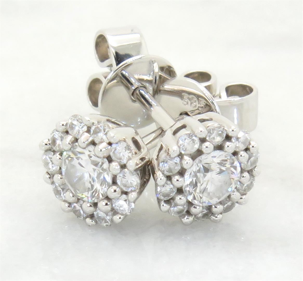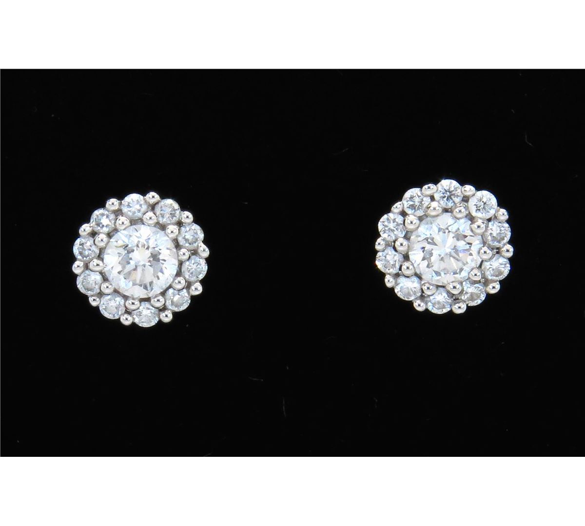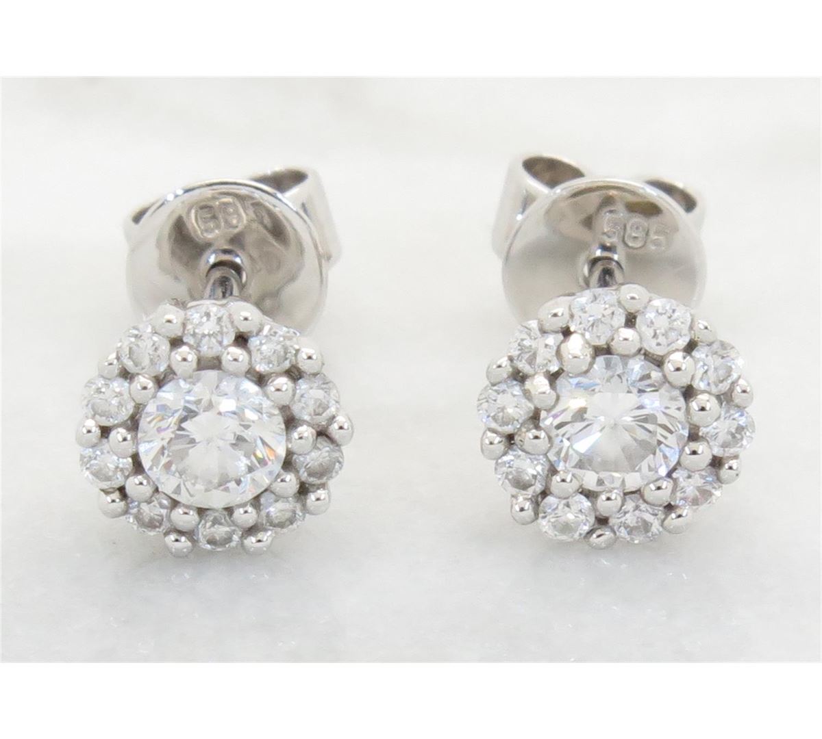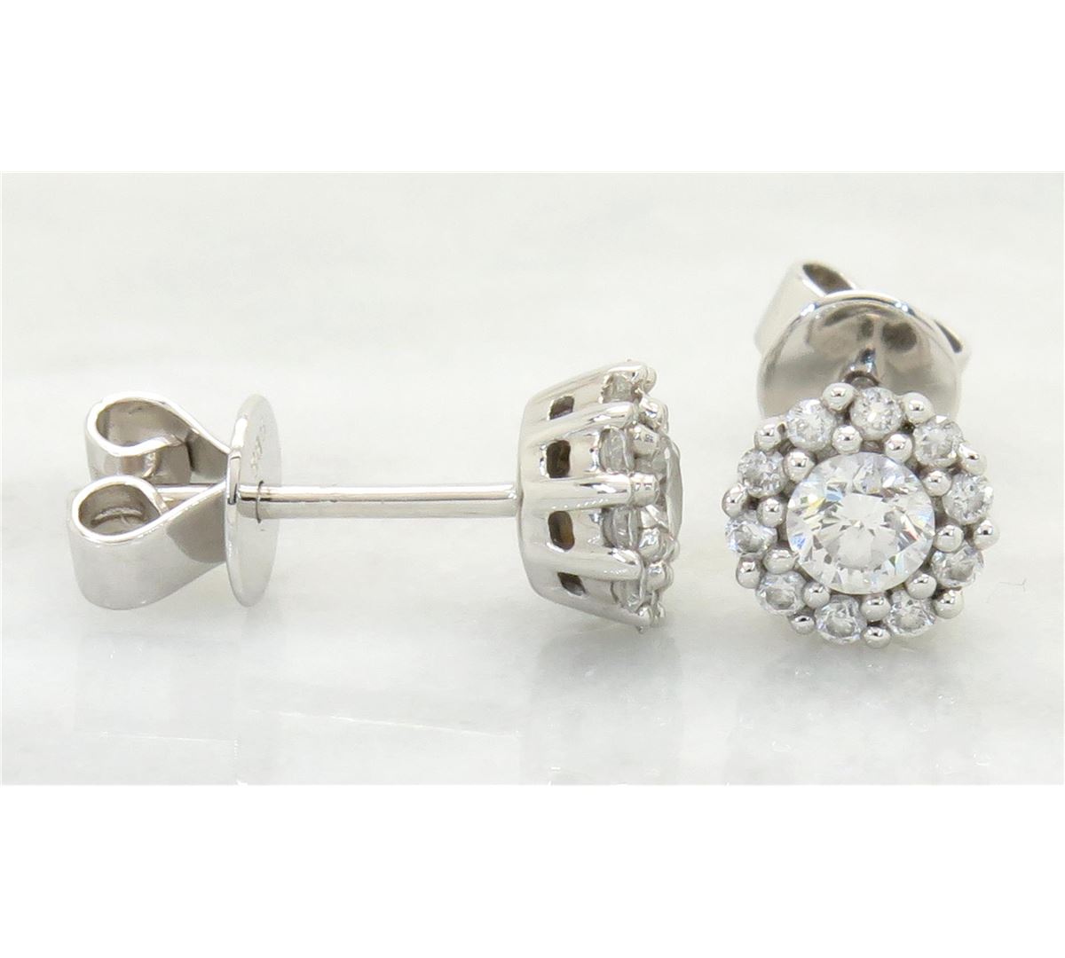 One tested pair of 14K white gold diamond earrings. Featuring: 22 Round Brilliant Cut Diamonds. Clarity: SI, Color: F-H. Approximate total diamond weight: .50CTW. All diamonds are graded in the mounting unless otherwise stated. Weight of earrings: 1.8 grams.