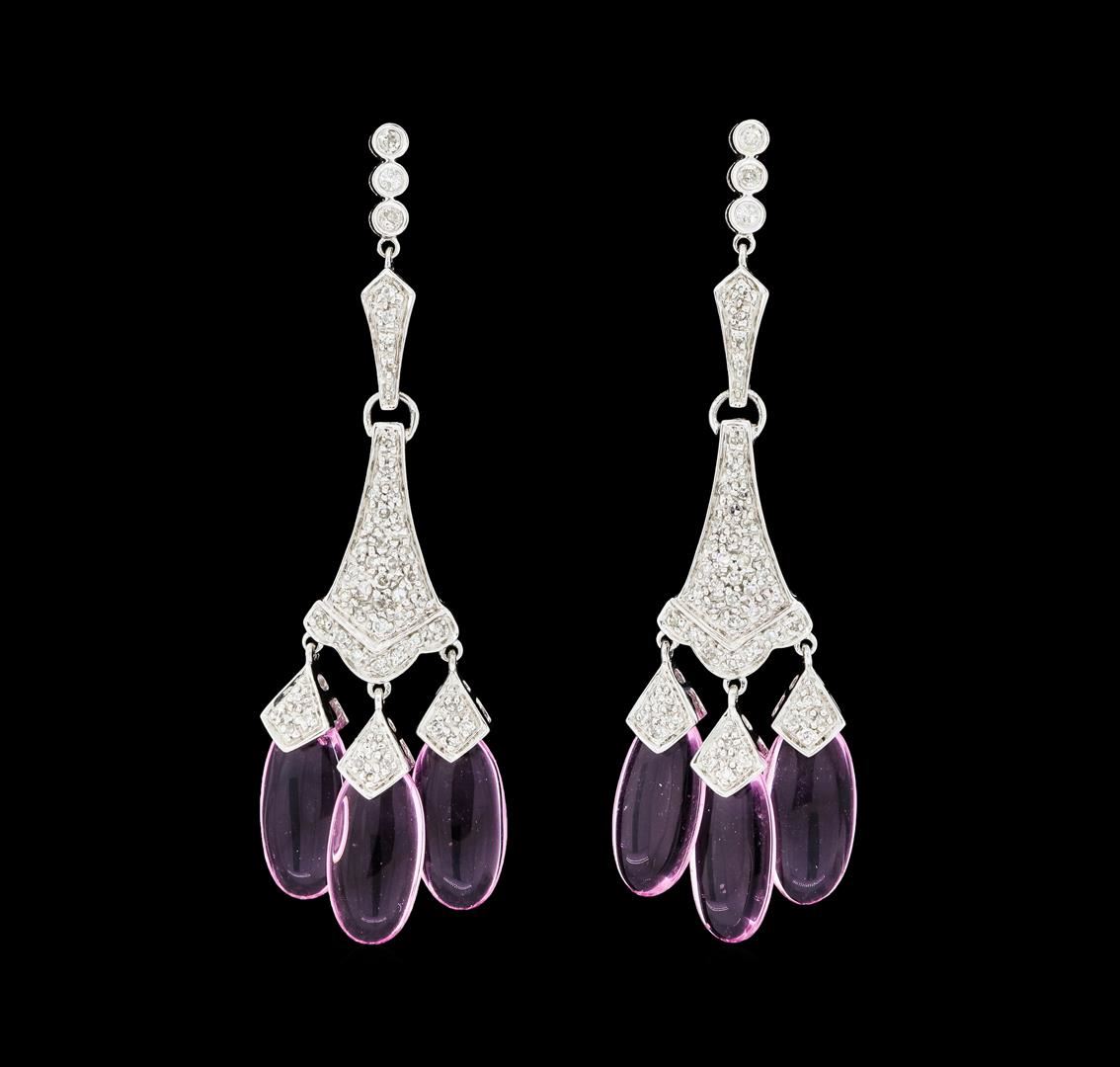 One pair of lady's earrings featuring: 14KT white gold weighing 8.1 grams containing diamonds weighing 0.50ctw and six dangling pieces of pink crystal.
