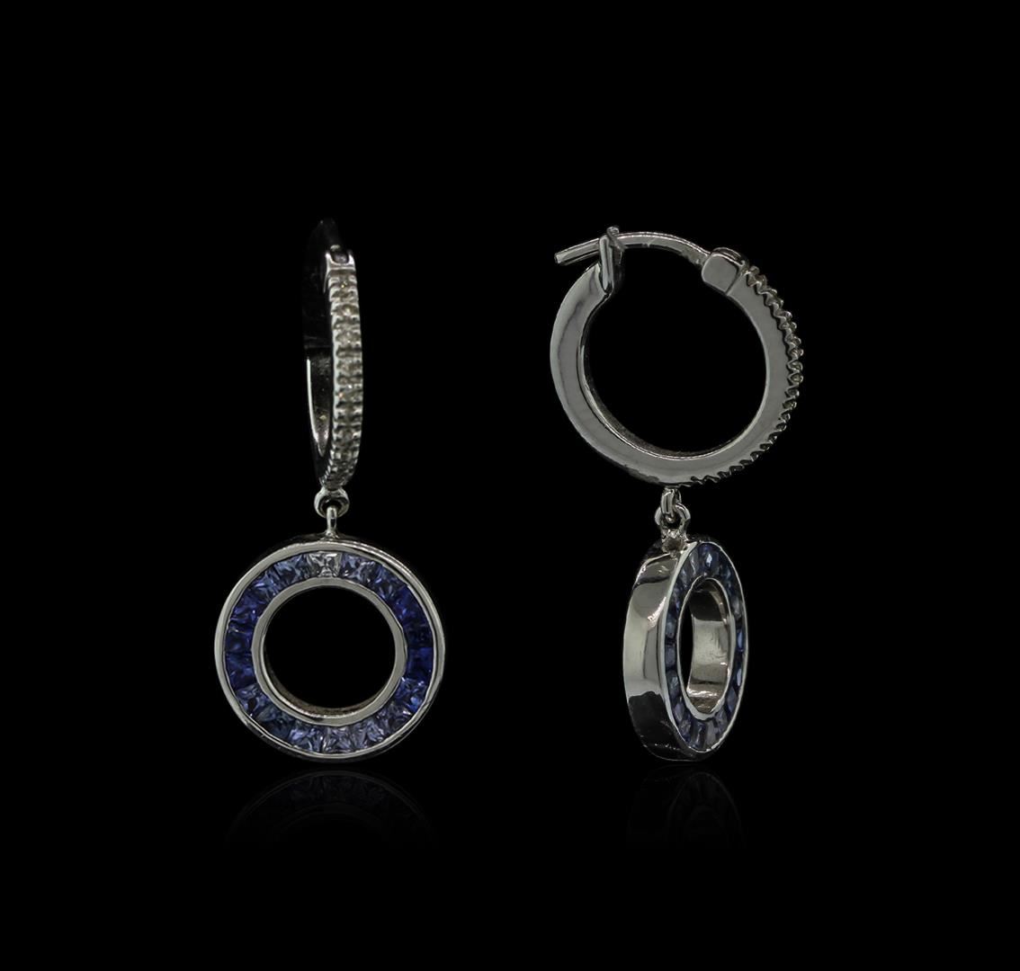 One pair of dangle earrings featuring: 14KT white gold weighing 5.20 grams containing channel set princess cut multi-sapphires with a total weight of 0.50ct and prong set round diamonds with a total weight of 0.10ct.