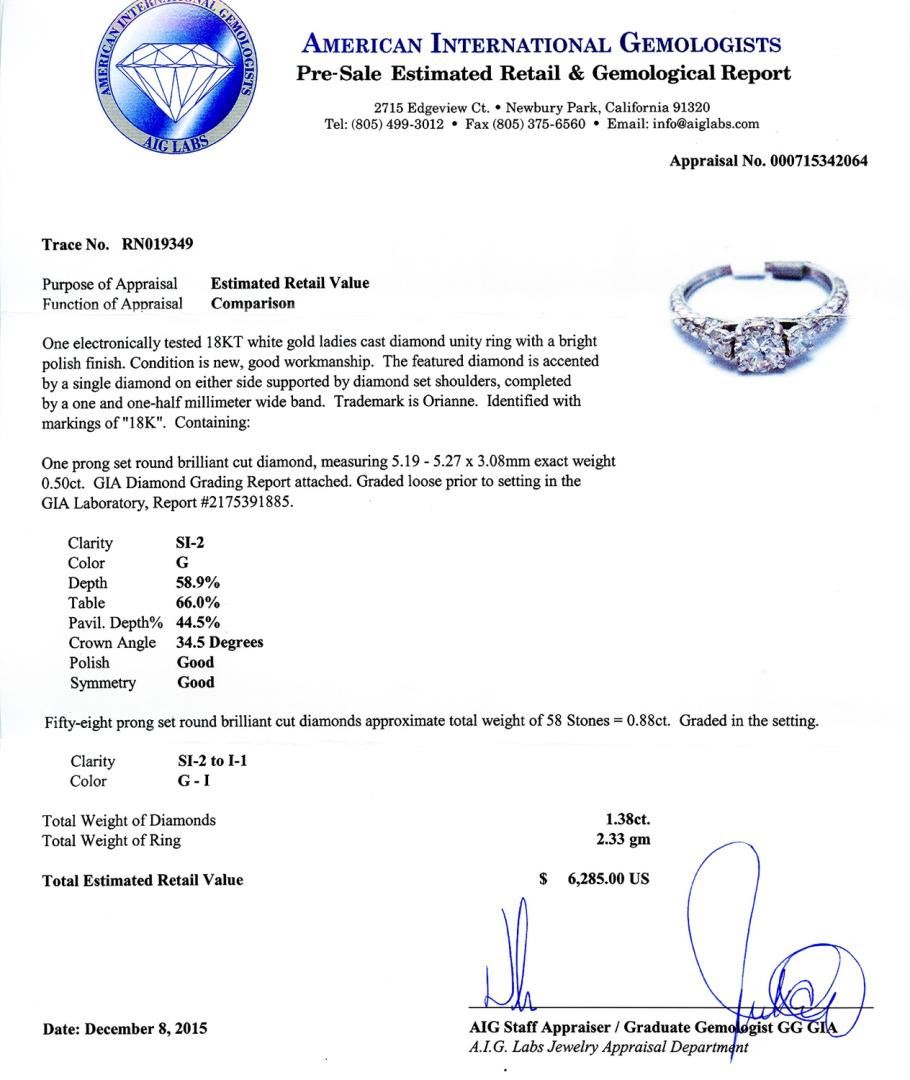 One electronically tested 18KT white gold ladies cast diamond unity ring with a bright polish finish. Condition is new, good workmanship. The featured diamond is accented by a single diamond on either side supported by diamond set shoulders, completed by a one and one-half millimeter wide band. Trademark is Orianne. Identified with markings of "18K". Containing: One prong set round brilliant cut diamond, measuring 5.19 - 5.27 x 3.08mm exact weight 0.50ct. GIA Diamond Grading Report attached. Graded loose prior to setting in the GIA Laboratory, Report #2175391885. Clarity: SI2 Color: G Depth: 58.9% Table: 66.0% Pavil. Depth%: 44.5% Crown Angle: 34.5 Degrees Polish: Good Symmetry: Good Fifty-eight prong set round brilliant cut diamonds approximate total weight of 58 Stones = 0.88ctw. Graded in the setting. Clarity: SI2 to I1 Color: G - I Total Weight of Diamonds 1.38ctw. Total Weight of Ring 2.33 gm #Size: 6 1/2
