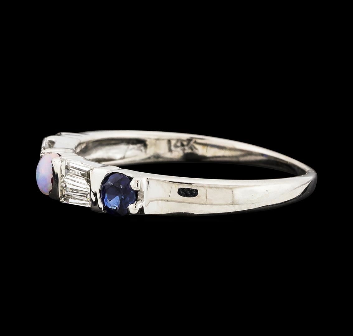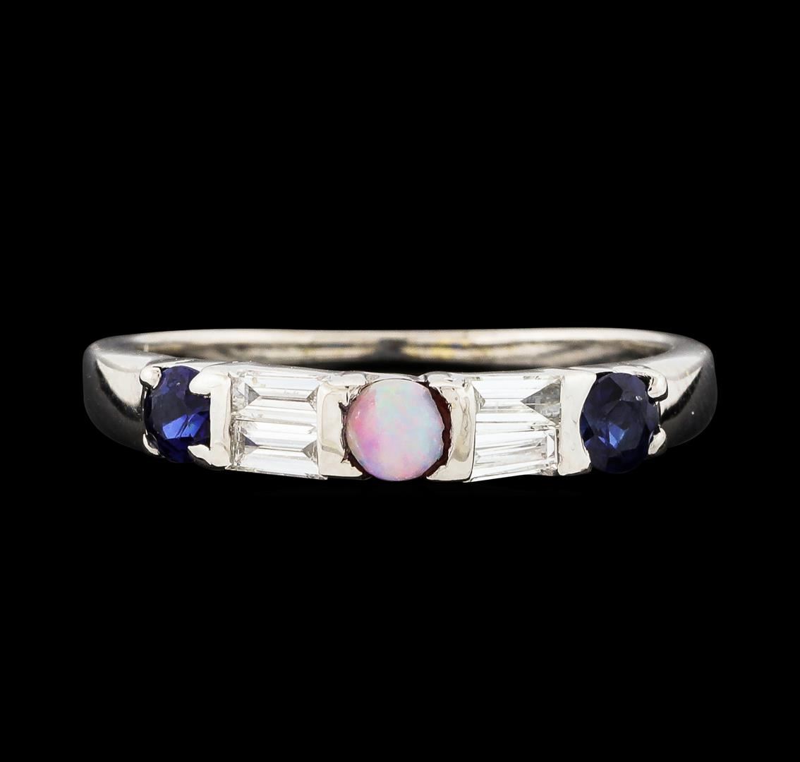 One ring: 14KT white gold weighing 2.40 grams containing one sapphire weighing 0.50ct, one opal weighing 0.25ct, and diamonds weighing 0.30ctw.