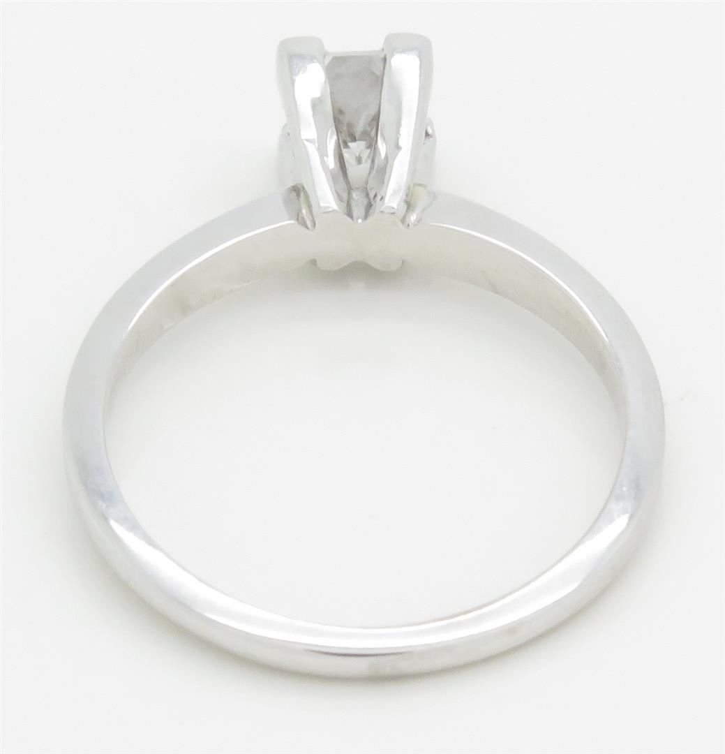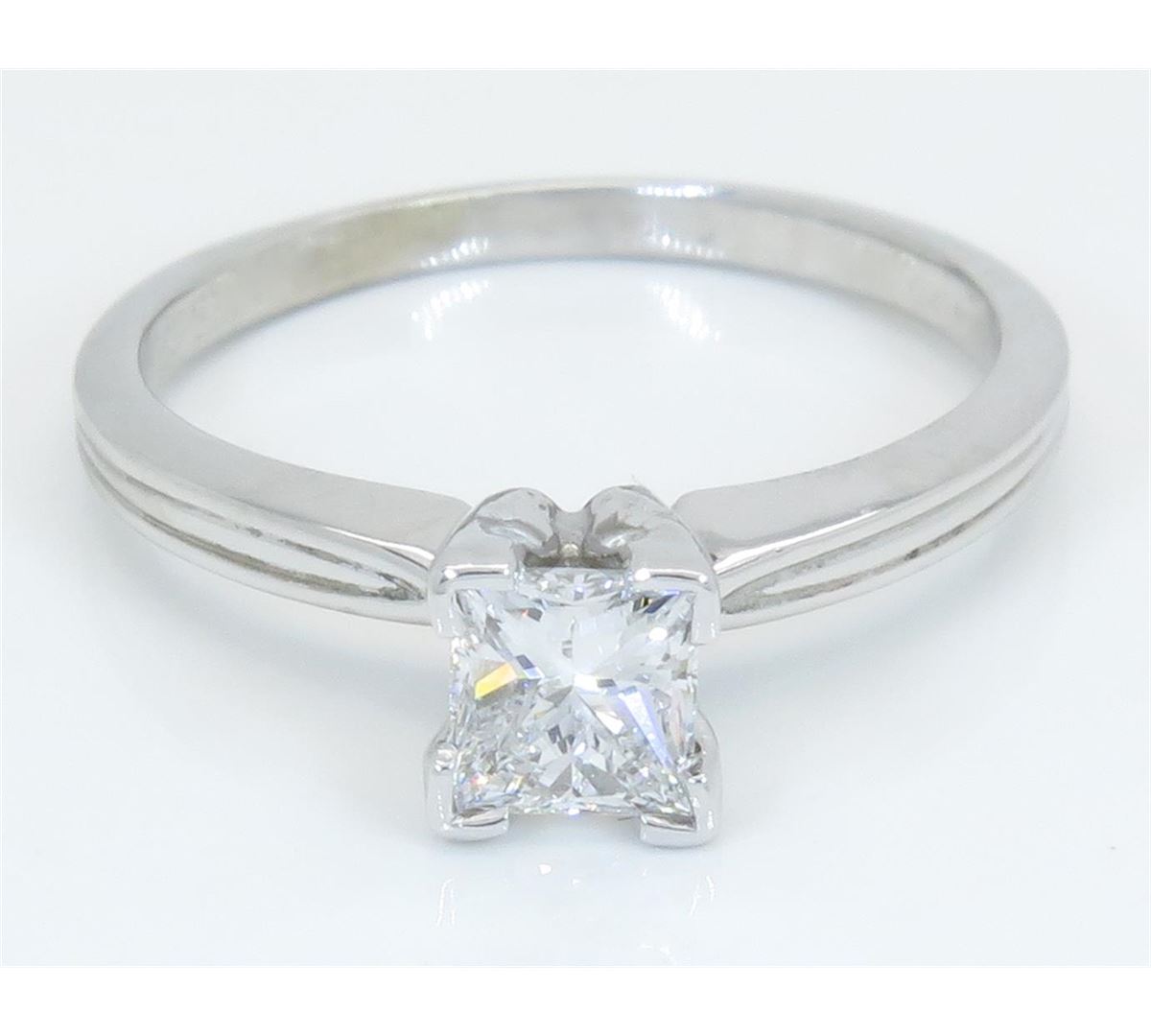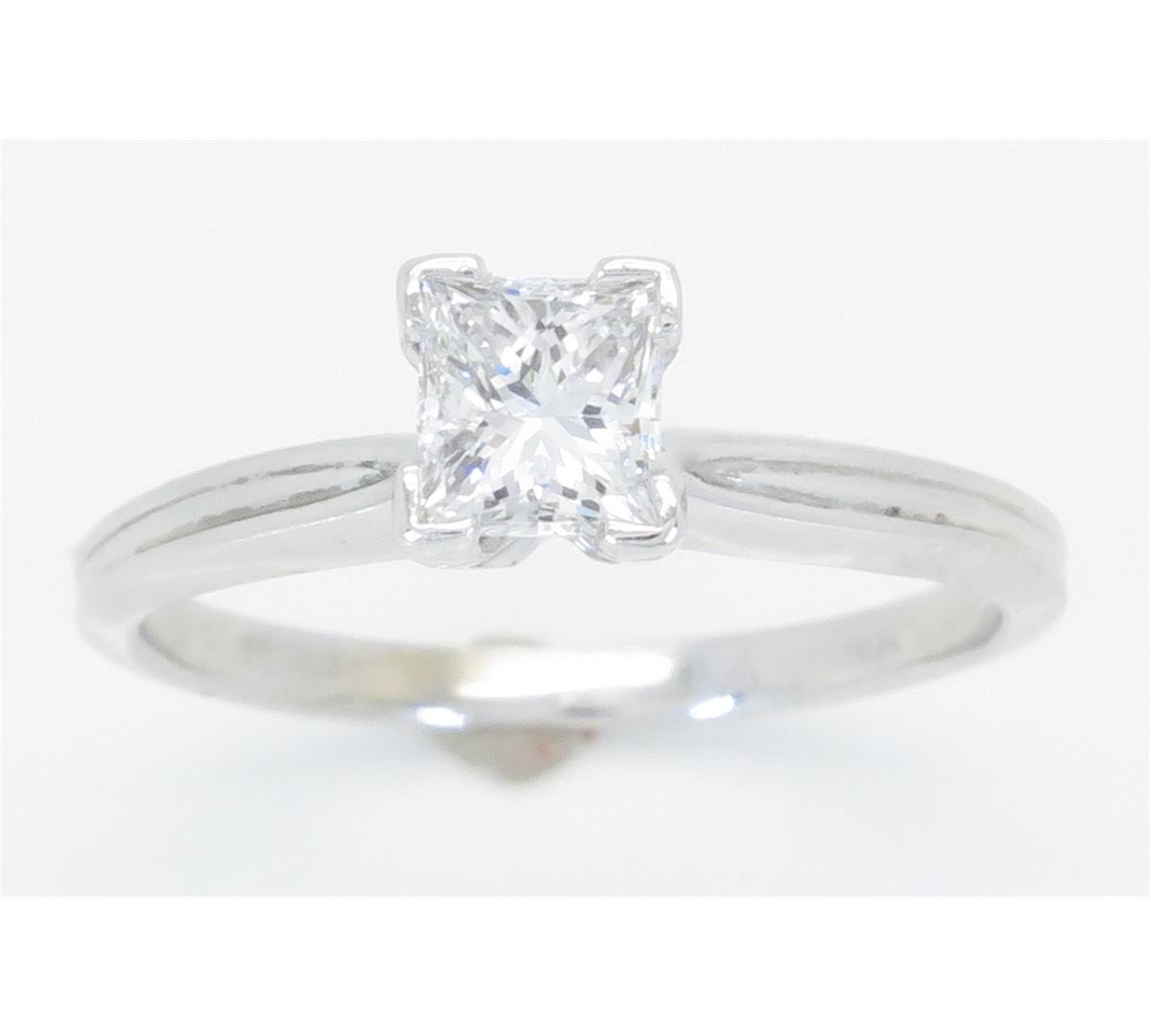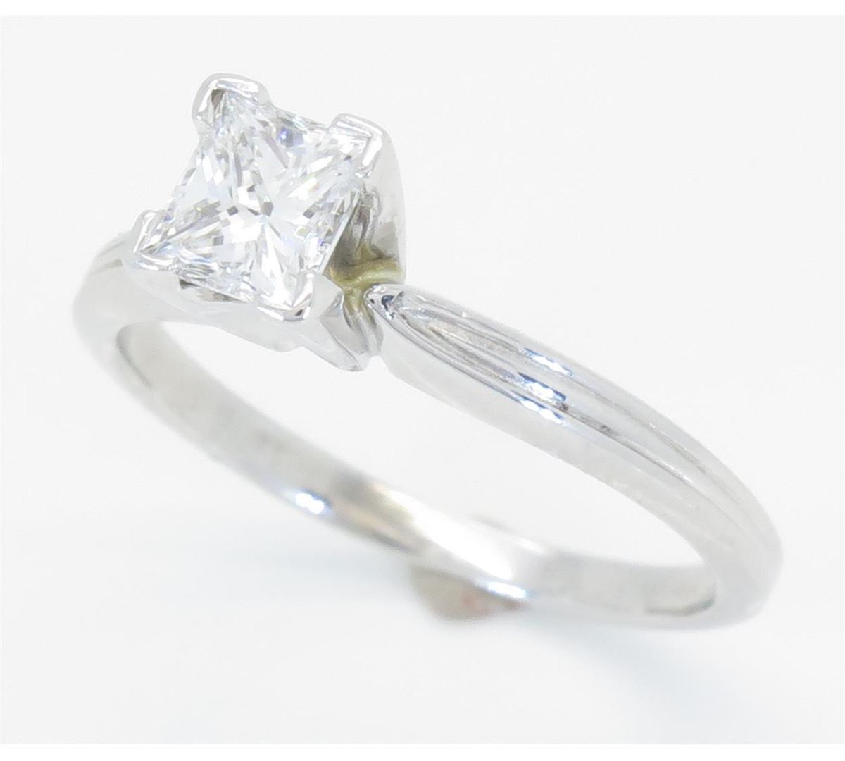 One tested 14K white gold diamond ring. Condition is new. Containing: one prong set Princess Cut Diamond. Approximate weight is .50CT. Clarity: VS2, Color: F-G. Diamonds are graded in the mounting, unless otherwise stated. Weight of ring: 2.47 grams. Size: 5.0.