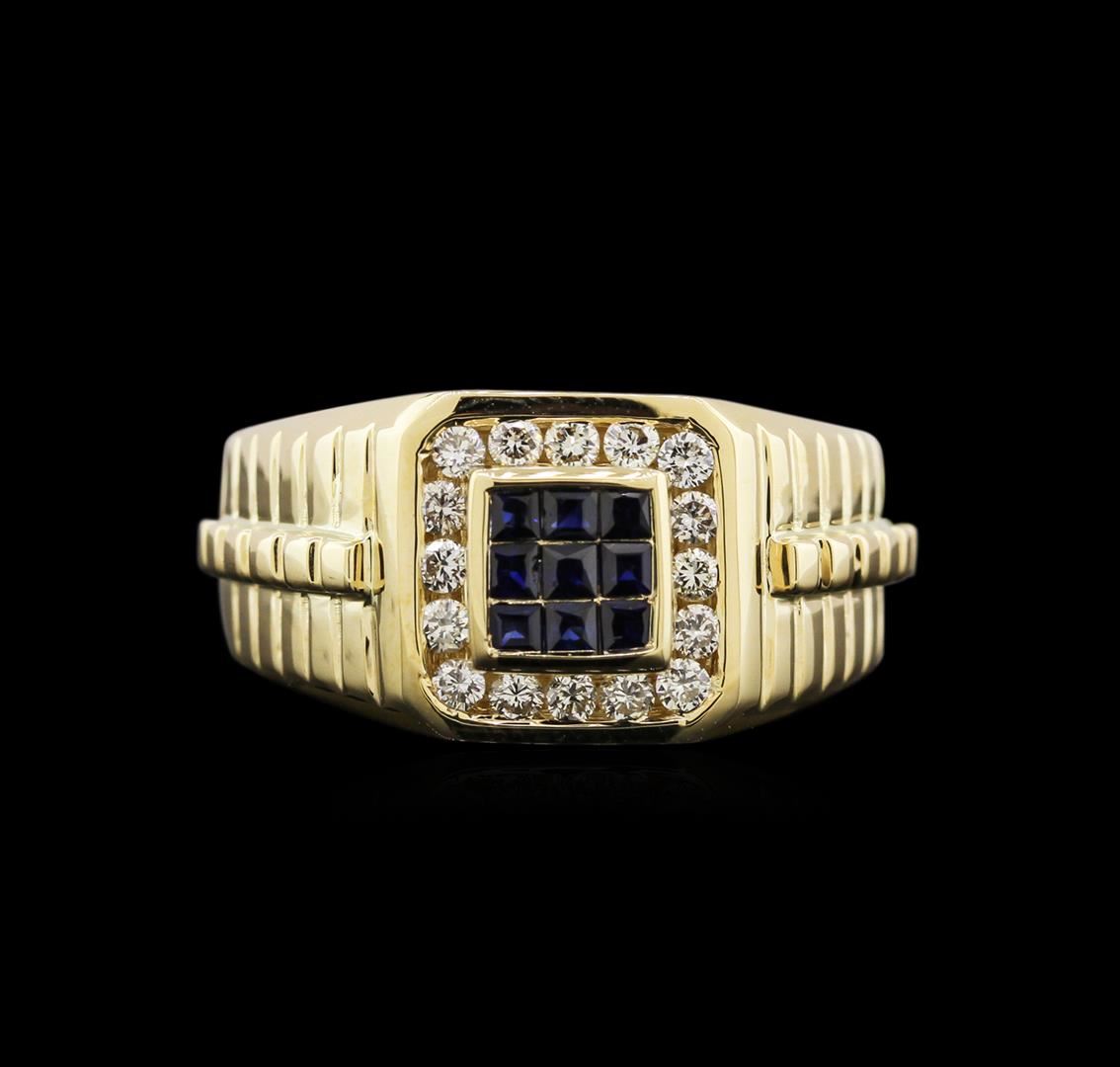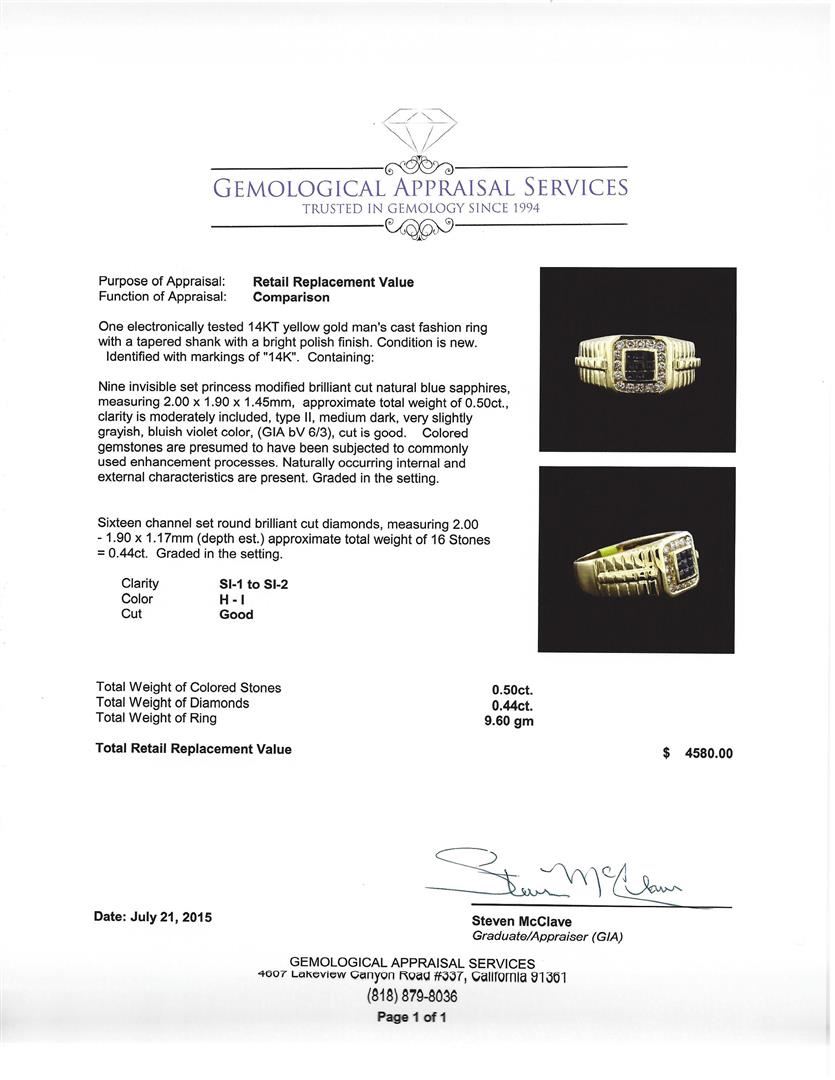 One electronically tested 14KT yellow gold man's cast fashion ring with a tapered shank with a bright polish finish. Condition is new. Identified with markings of "14K". Containing: Nine invisible set princess modified brilliant cut natural blue sapphires, measuring 2.00 x 1.90 x 1.45mm, approximate total weight of 0.50ct., clarity is moderately included, type II, medium dark, very slightly grayish, bluish violet color, (GIA bV 6/3), cut is good. Colored gemstones are presumed to have been subjected to commonly used enhancement processes. Naturally occurring internal and external characteristics are present. Graded in the setting. Sixteen channel set round brilliant cut diamonds, measuring 2.00 - 1.90 x 1.17mm (depth est.) approximate total weight of 16 Stones = 0.44ct. Graded in the setting. Clarity: SI-1 to SI-2. Color: H - I. Cut: Good. Total Weight of Colored Stones: 0.50ct. Total Weight of Diamonds: 0.44ct. Total Weight of Ring: 9.60 gm. GAS Appraised at $4,580.00.