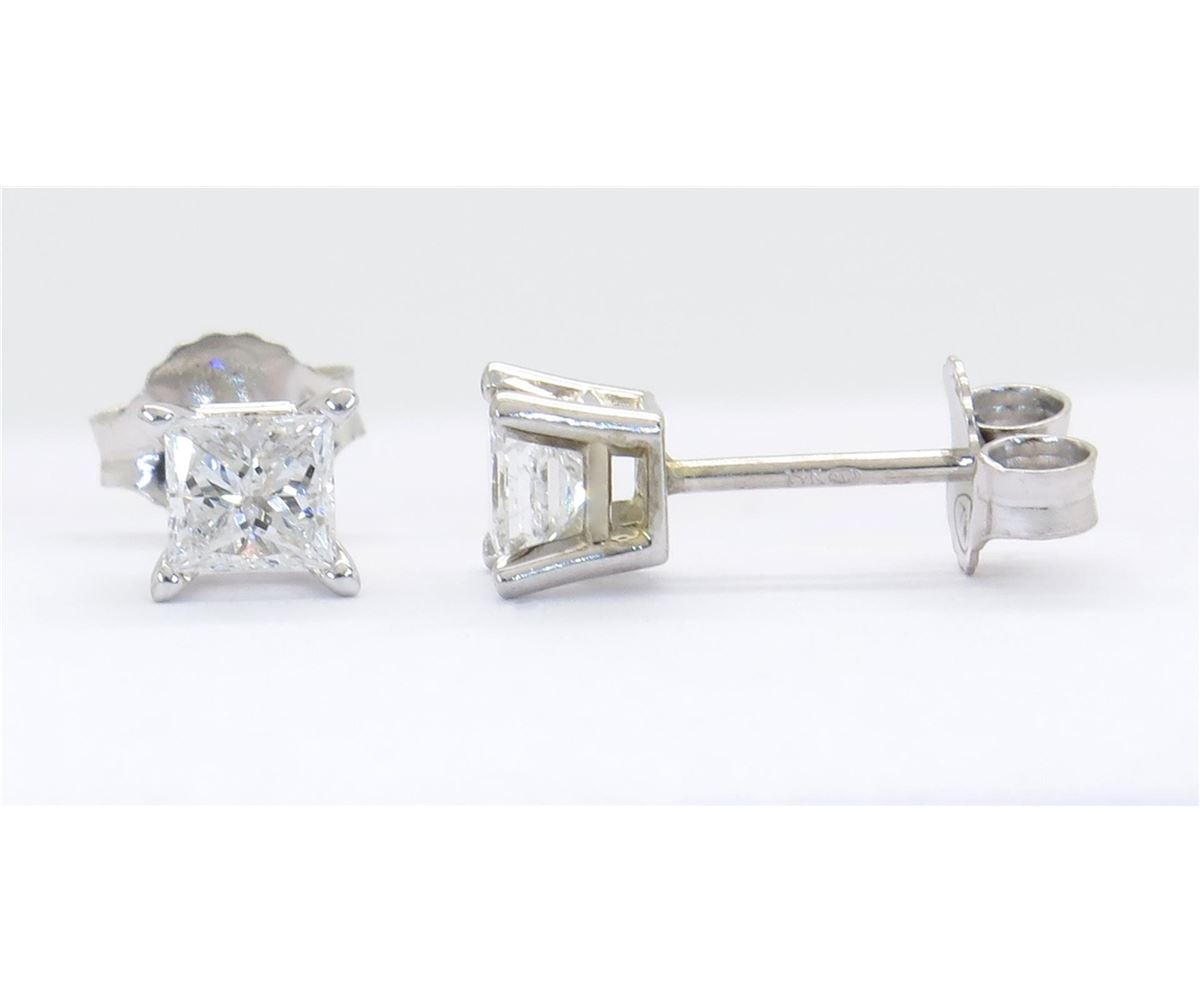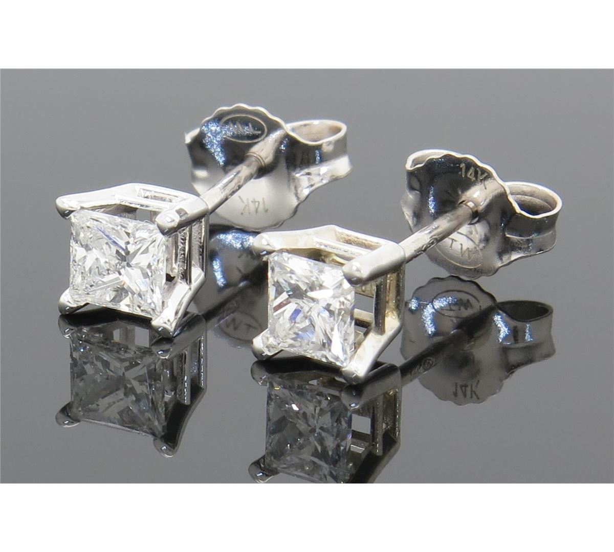 One pair of tested 14K white gold diamond earrings. Containing: Two Princess Cut Diamonds. Clarity: I, Color: G-H. Approximate total diamond weight: .50CTW. Diamonds are graded in the mounting, unless otherwise stated. Weight: 0.9 grams.