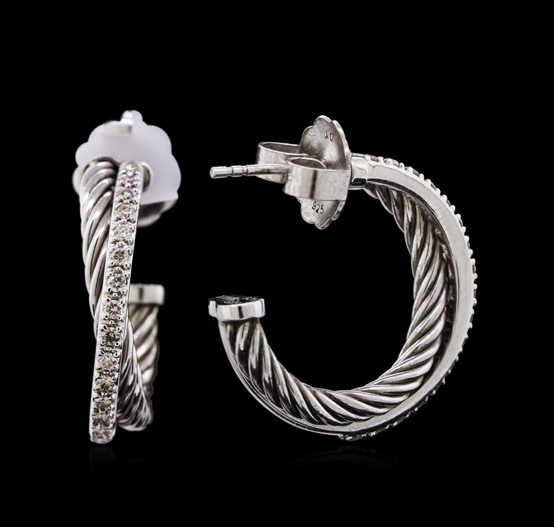 0.50ctw Diamond Hoop Earrings - 14KT White Gold and Sterling Silver. Sterling silver 925 cable crossed with 14K white gold housing; 50 carats of sparkling, white DY diamonds and a 14K posts; They weigh 4.6 gms each; 9.2 g total weight for both earrings; properly hallmarked "D.Y. 585 925."