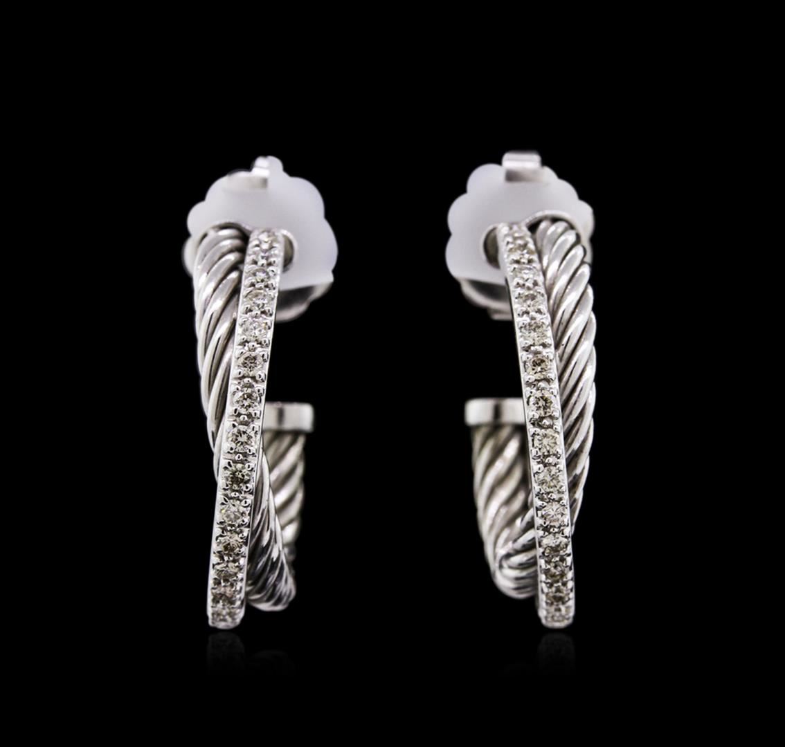 0.50ctw Diamond Hoop Earrings - 14KT White Gold and Sterling Silver. Sterling silver 925 cable crossed with 14K white gold housing; 50 carats of sparkling, white DY diamonds and a 14K posts; They weigh 4.6 gms each; 9.2 g total weight for both earrings; properly hallmarked "D.Y. 585 925."