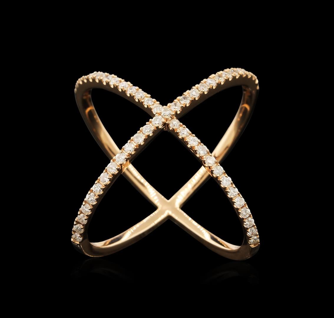 One crossover design ring featuring: 14KT rose gold weighing 3.37 grams containing prong set round diamonds with a total weight of 0.50ct.
