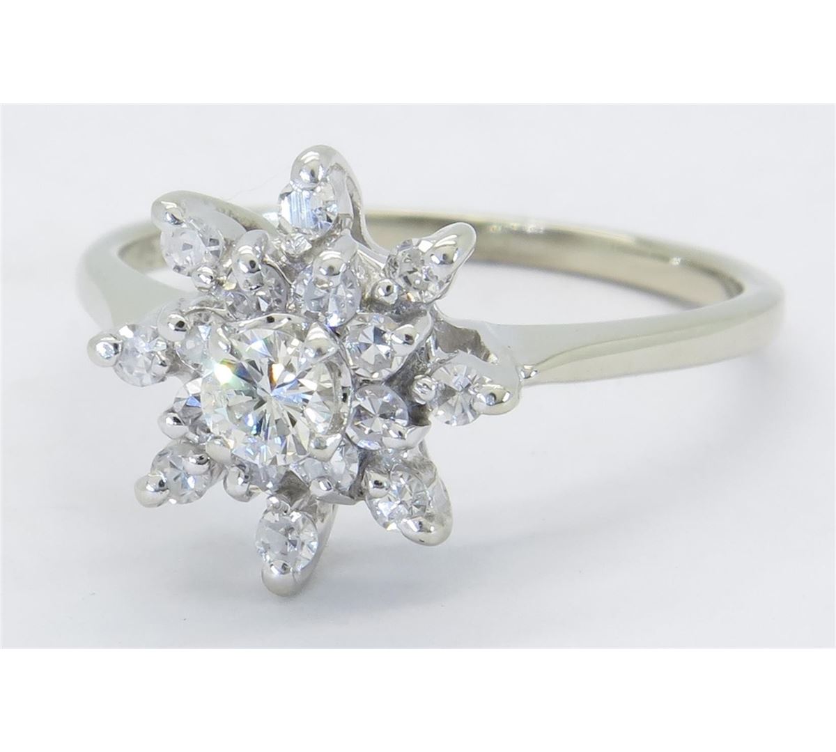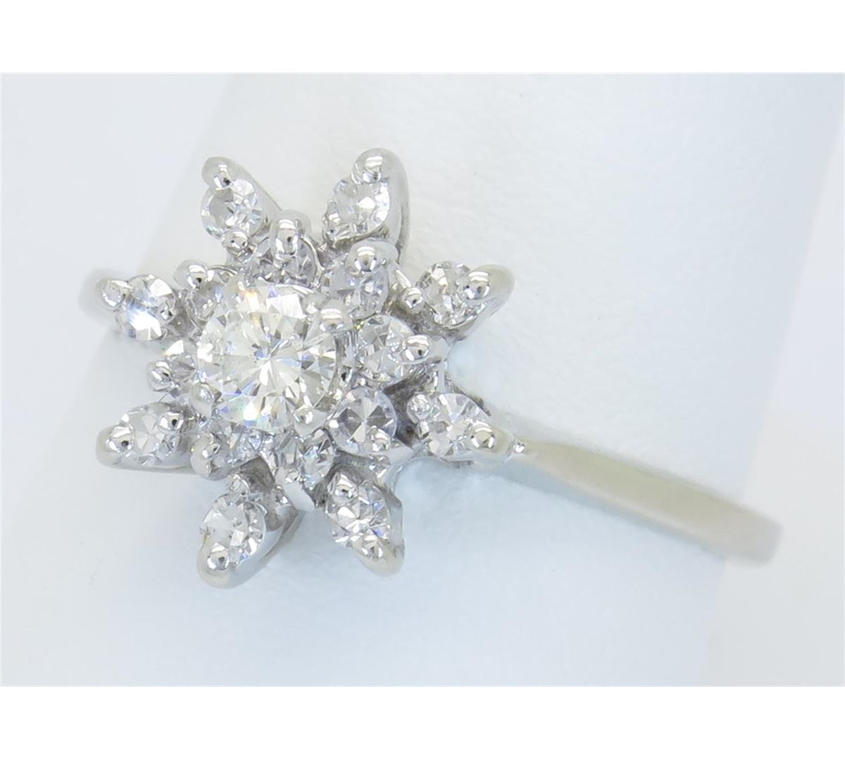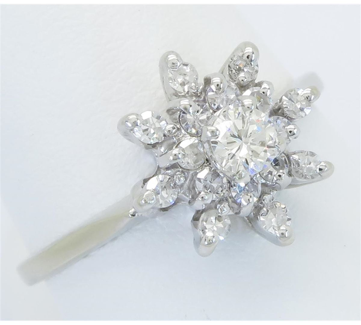 One tested 14K white gold diamond ring. Containing: One Round Brilliant Cut Diamond, 16 Round Single Cut Diamonds. Clarity: I-SI, Color: F-G. Approximate total diamond weight: .50CTW. Diamonds are graded in the mounting, unless otherwise stated. Weight: 3.1 grams. Size: 7.25