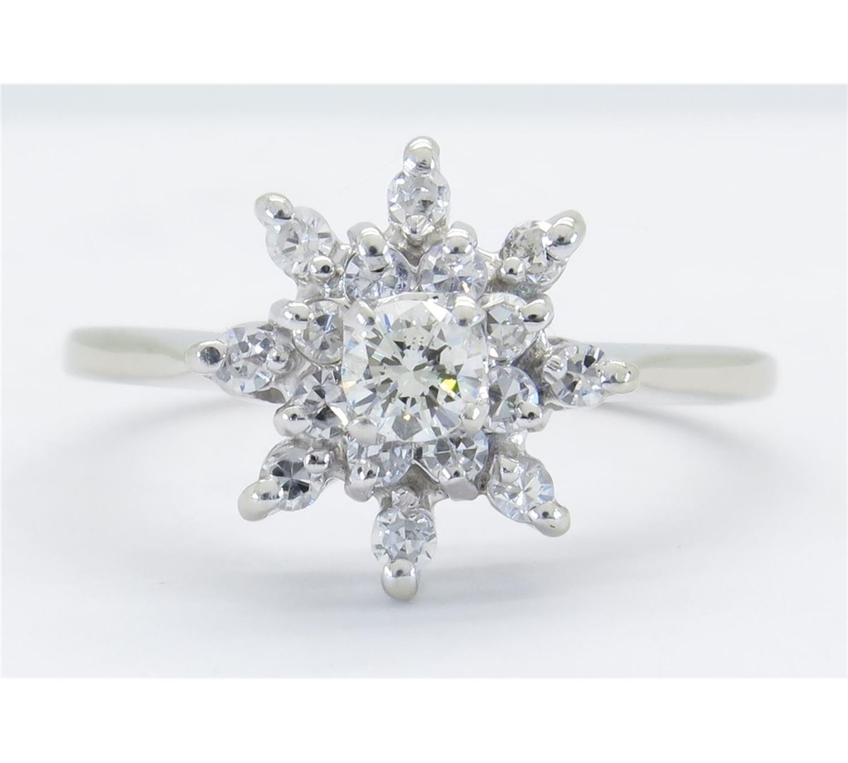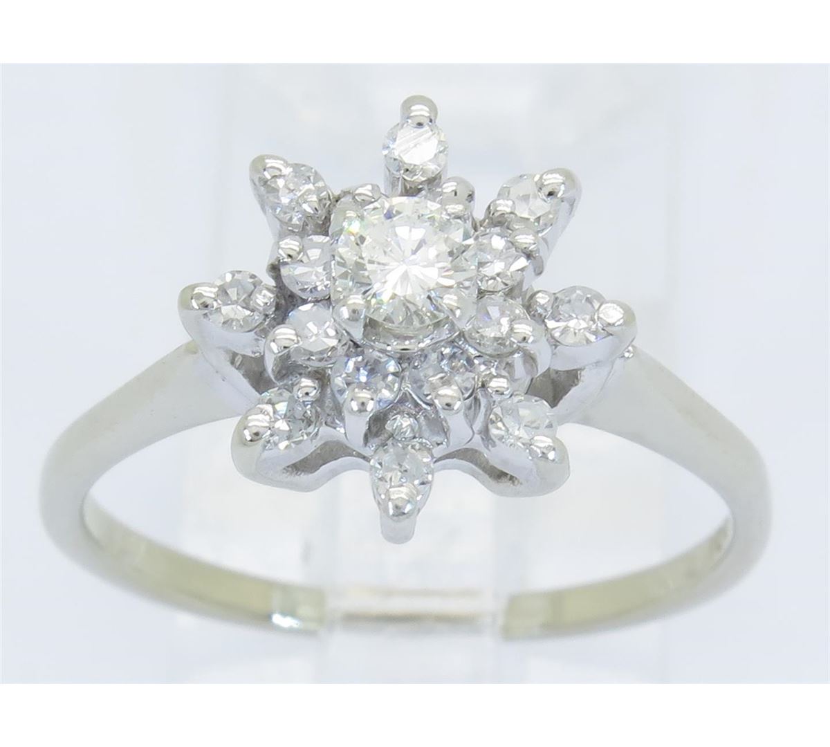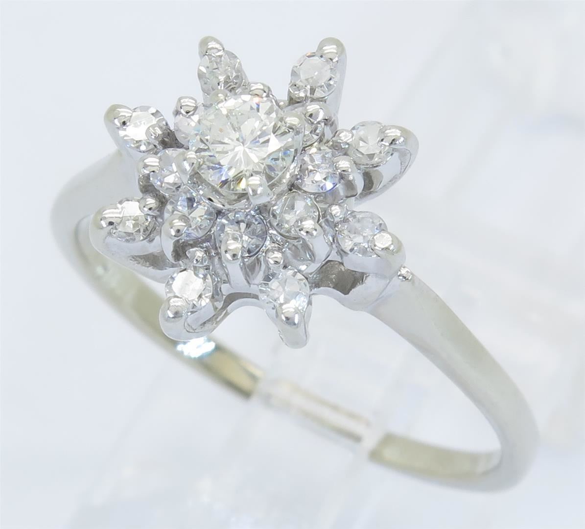One tested 14K white gold diamond ring. Containing: One Round Brilliant Cut Diamond, 16 Round Single Cut Diamonds. Clarity: I-SI, Color: F-G. Approximate total diamond weight: .50CTW. Diamonds are graded in the mounting, unless otherwise stated. Weight: 3.1 grams. Size: 7.25