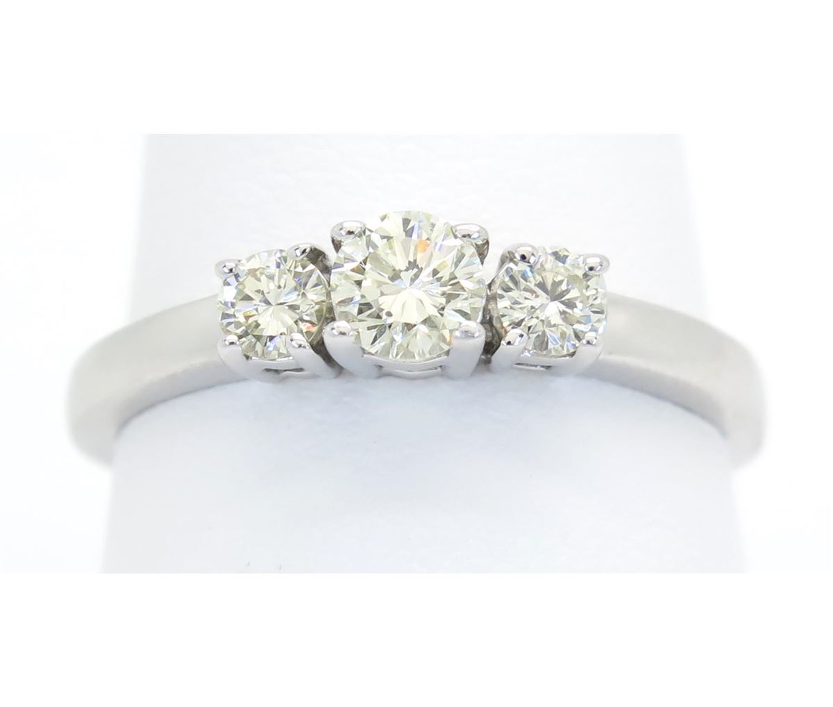 One tested 14K white gold diamond ring. Containing: One Round Brilliant Cut Diamond. Approximate size: .29CT, Clarity: SI. Color: J-K. 2 Round Brilliant Cut Diamonds. Approximate total diamond weight: .50CTW. Diamonds are graded in the mounting, unless otherwise stated. Weight: 2.3 grams. Size: 7.25