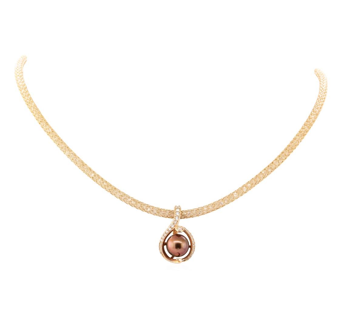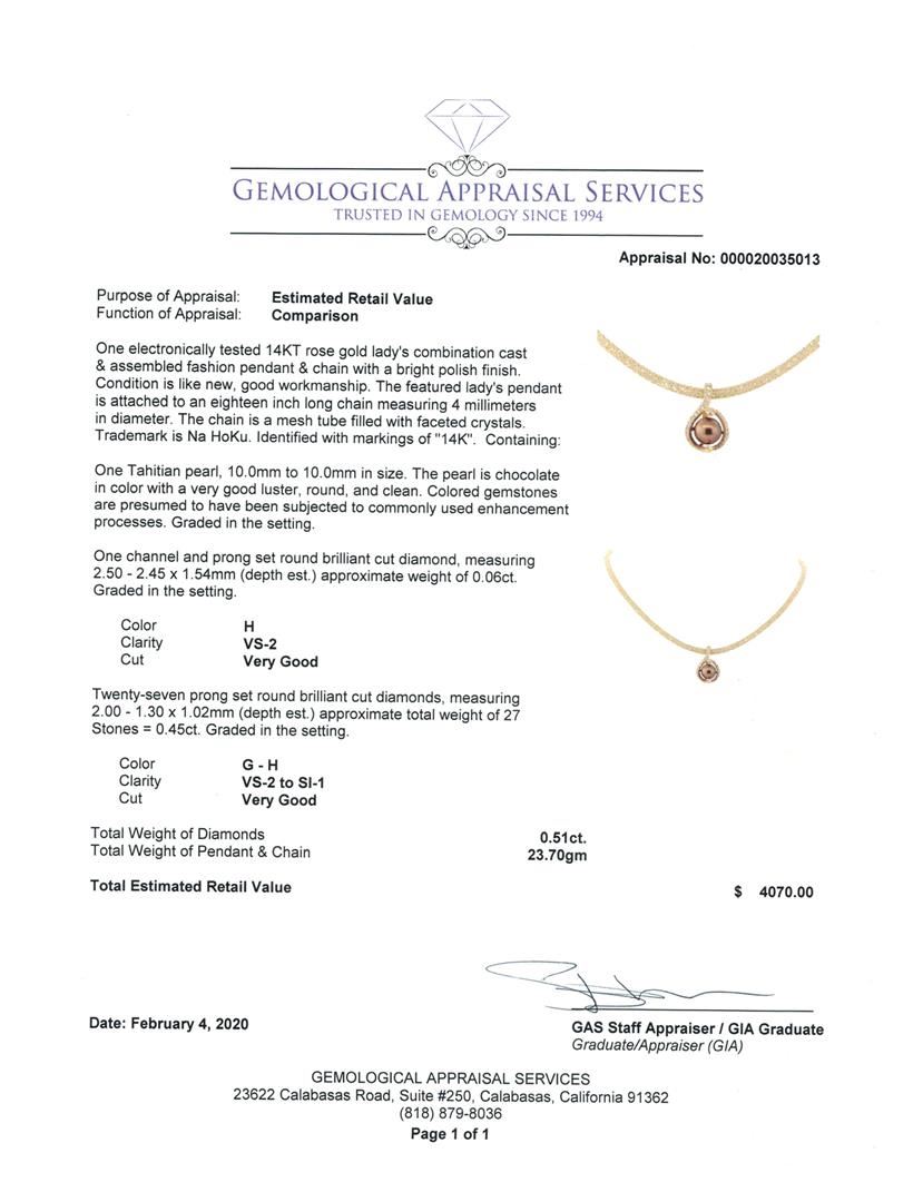 One electronically tested 14KT rose gold lady's combination cast & assembled fashion pendant & chain with a bright polish finish. The featured lady's pendant is attached to an eighteen inch long chain measuring 4 millimeters in diameter. The chain is a mesh tube filled with faceted crystals. Trademark is Na HoKu. Identified with markings of '14K'. Condition is like new, good workmanship. Containing: One Tahitian pearl, 10.0mm to 10.0mm in size. The pearl is chocolate in color with a very good luster, round, and clean. Colored gemstones are presumed to have been subjected to commonly used enhancement processes. Graded in the setting. One channel and prong set round brilliant cut diamond, measuring 2.50 - 2.45 x 1.54mm (depth est.) approximate weight of 0.06ct. Graded in the setting. Color H Clarity VS-2 Cut Very Good Twenty-Seven prong set round brilliant cut diamonds, measuring 2.00 - 1.30 x 1.02mm (depth est.) approximate total weight of 27 Stones = 0.45ct. Graded in the setting. Color G - H Clarity VS-2 to SI-1 Cut Very Good. Total Weight of Diamonds 0.51ct.. Total Weight of Pendant & Chain 23.70gm GAS Appraised at $4070.00. GAS Appraised.