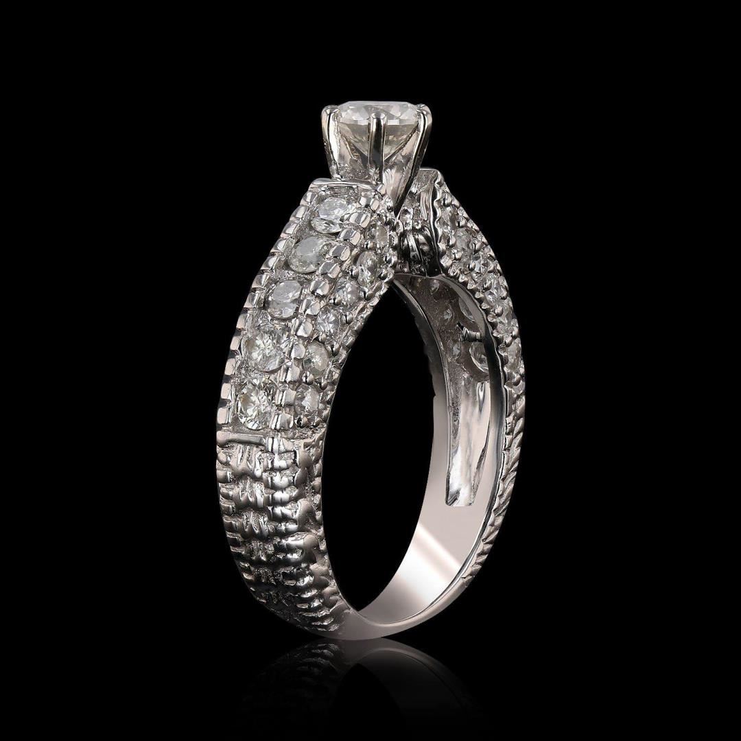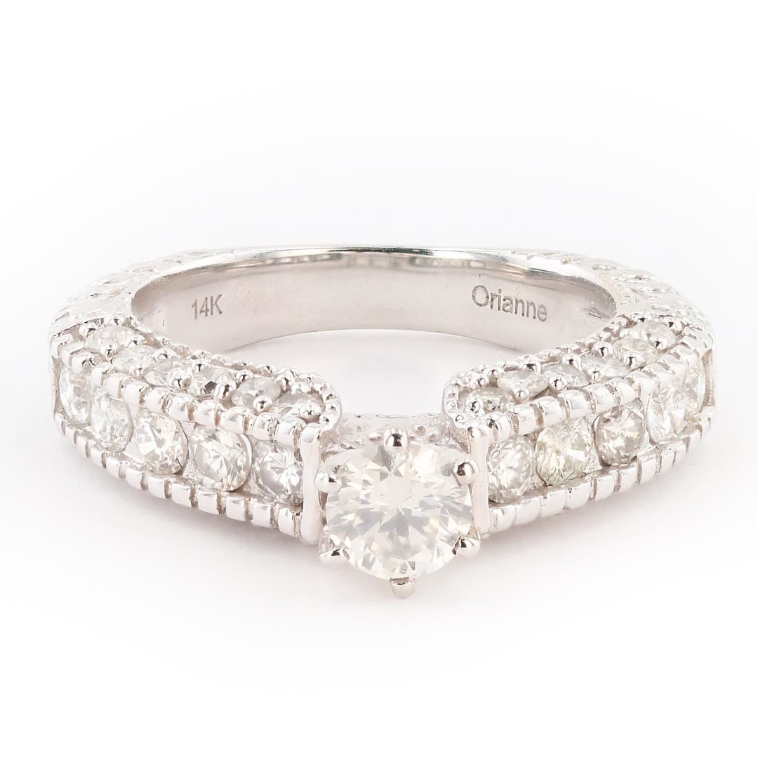 One electronically tested 14KT white gold ladies cast & assembled diamond unity ring. Condition is new, good workmanship. The featured diamond is set within diamond set shoulders, completed by a three millimeter wide band. Bright polish finish with Mil grain detailing throughout. Trademark is Orianne. Identified with markings of "14K". One prong set round brilliant cut diamond, measuring 5.00 - 5.00 x 3.10mm (depth est.) approximate weight of 0.51ct. Graded in the setting. Clarity SI-2 Color J Depth 62.0% Table 60.4% Polish Good Symmetry Good Thirty-four prong & channel set round brilliant cut diamonds, measuring 2.50 - 1.70 x 1.26mm (depth est.) approximate total weight of 34 Stones = 1.21ctw. Graded in the setting. Clarity I-1 to I-2 Color G - I Total Weight of Diamonds 1.72ctw. Total Weight of Unity Ring 7.20 gm