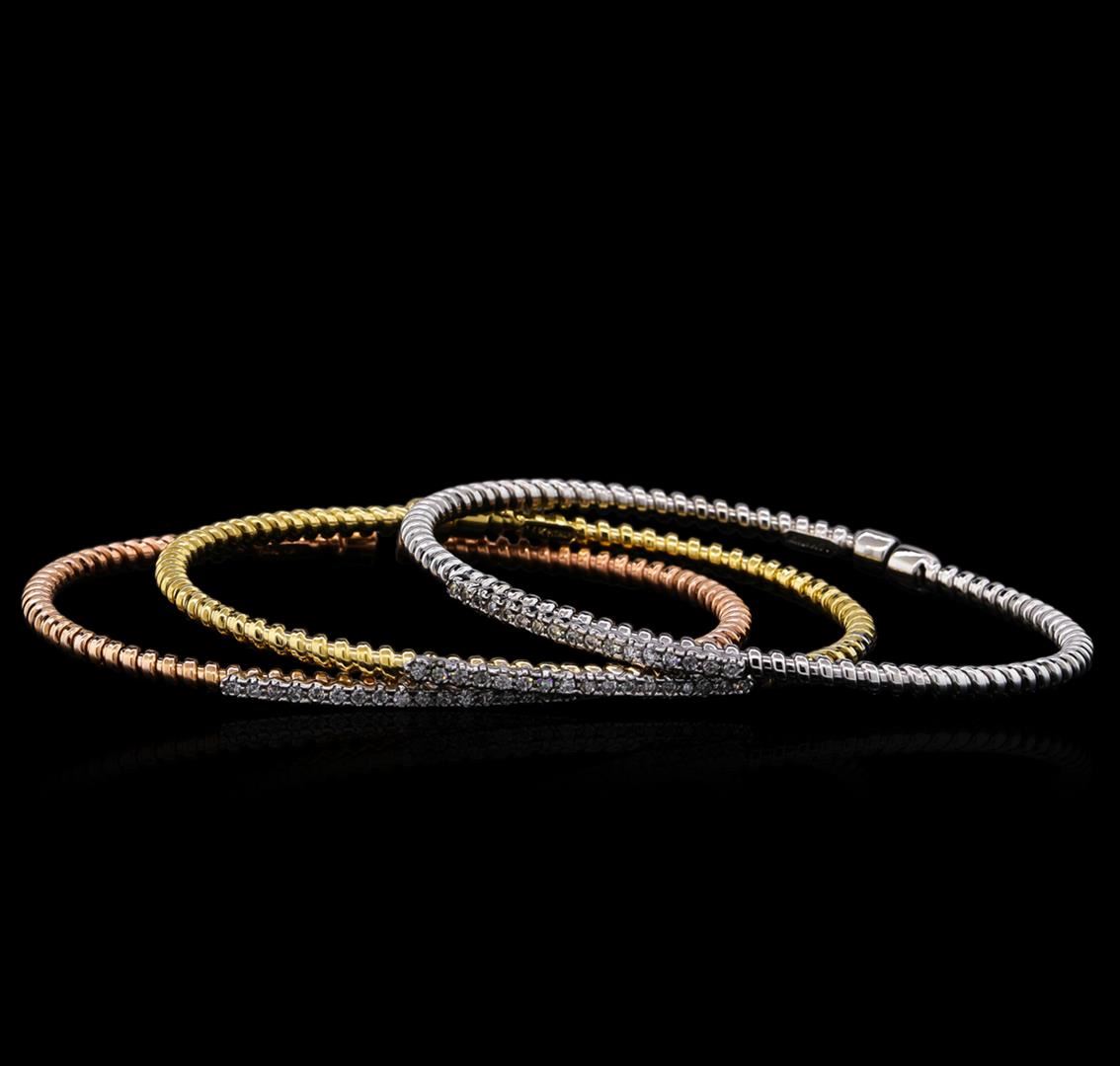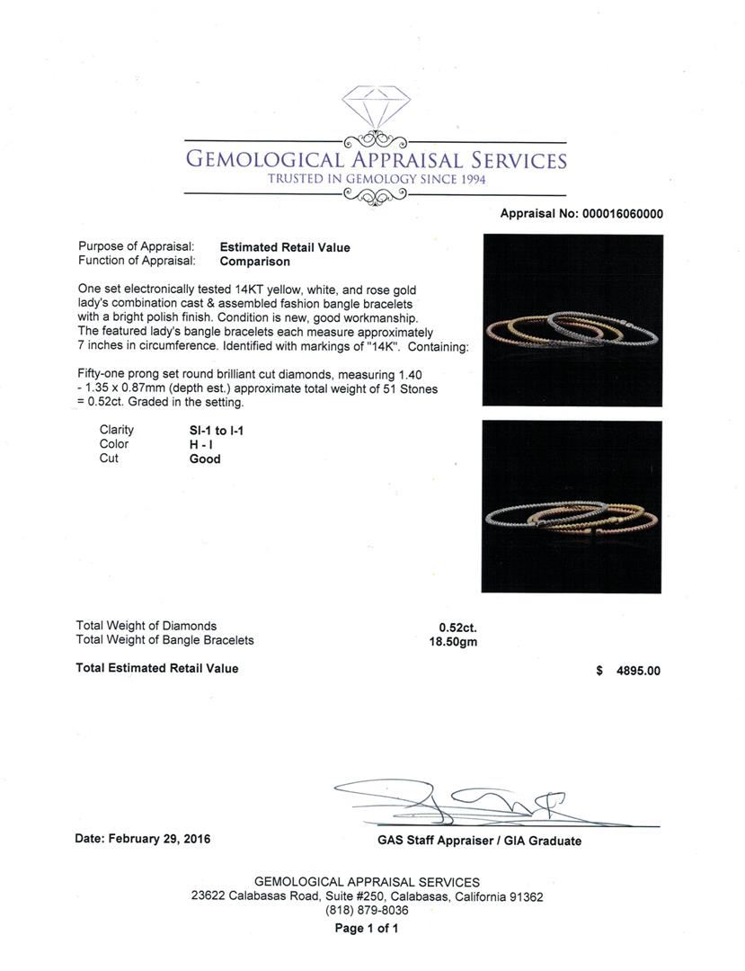 One set electronically tested 14KT yellow, white, and rose gold lady's combination cast & assembled fashion bangle bracelets with a bright polish finish. The featured lady's bangle bracelets each measure approximately 7 inches in circumference. Identified with markings of "14K". Condition is new, good workmanship. Containing: Fifty-One prong set round brilliant cut diamonds, measuring 1.40 - 1.35 x 0.87mm (depth est.) approximate total weight of 51 Stones = 0.52ct. Graded in the setting. Clarity: SI-1 to I-1. Color: H - I. Cut Good. Total Weight of Diamonds 0.52ct. Total Weight of Bangle Bracelets 18.50gm. GAS Appraised at $4,895.00.