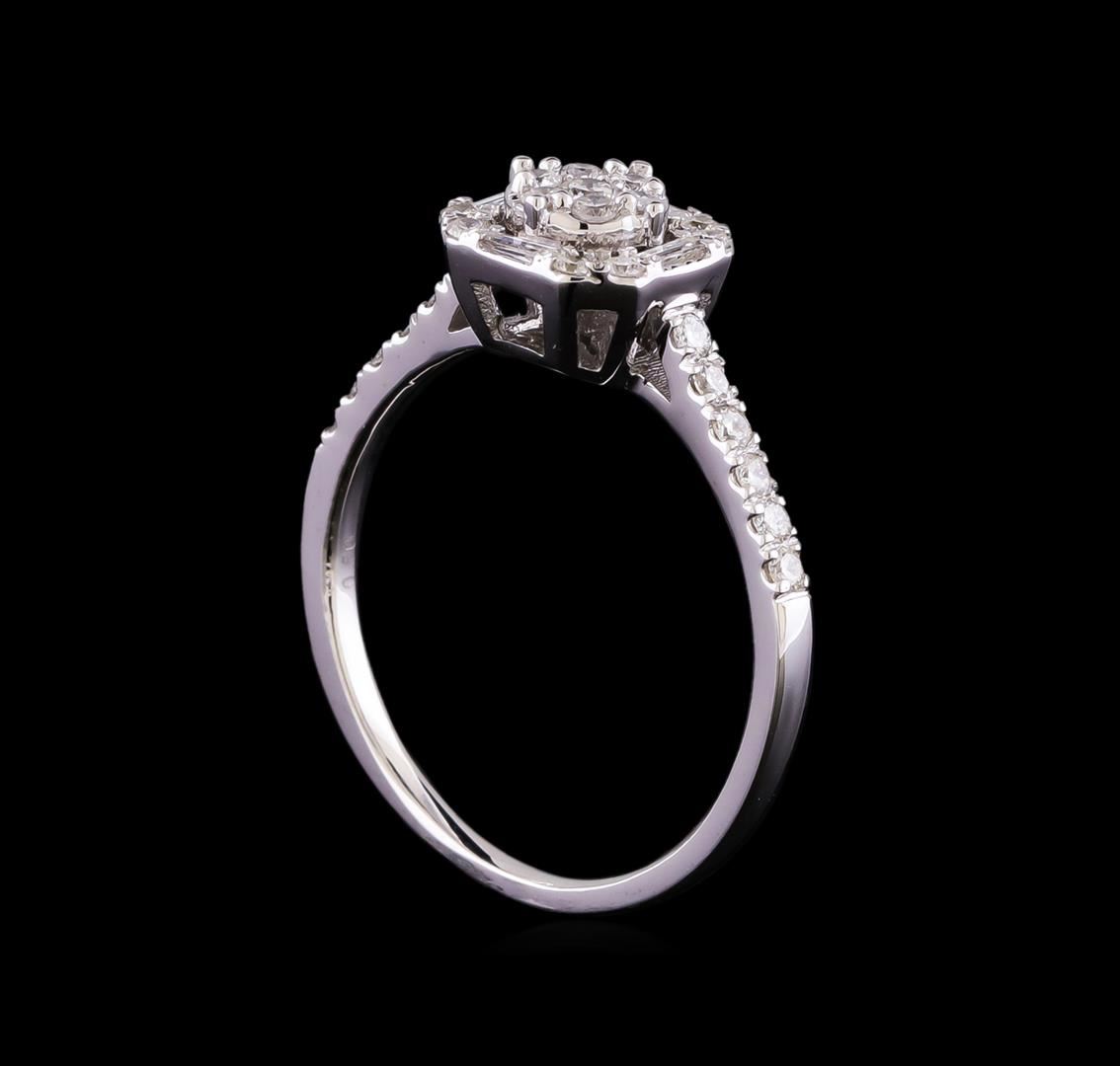 One electronically tested 14KT white gold lady's cast wedding ring with a cathedral halo with a bright polish finish. The featured lady's ring has a shank measuring 1.40 millimeters in width. Identified with markings of '14K'. Condition is new, good workmanship. Containing: One prong set round brilliant cut diamond, measuring 2.30 - 2.25 x 1.41mm (depth est.) approximate weight of 0.05ct. Graded in the setting. Clarity I-1. Color: H Cut Good Twenty-Six prong set round brilliant cut diamonds, measuring 1.60 - 1.50 x 0.96mm (depth est.) approximate total weight of 26 Stones = 0.37ct. Graded in the setting. Clarity SI-1 to SI-2. Color: G - I Cut Good Four prong set baguette cut diamonds, measuring from 2.55 x 1.10 x 0.94mm (depth est.) to 2.60 x 1.20 x 1.02mm (depth est.) approximate total weight of 4 Stones = 0.10ct. Graded in the setting. Clarity VS-2 to SI-2. Color: G - H Cut Good. Total Weight of Diamonds 0.52ct.. Total Weight of Ring 2.90gm. GAS Appraised at $1,875.00.