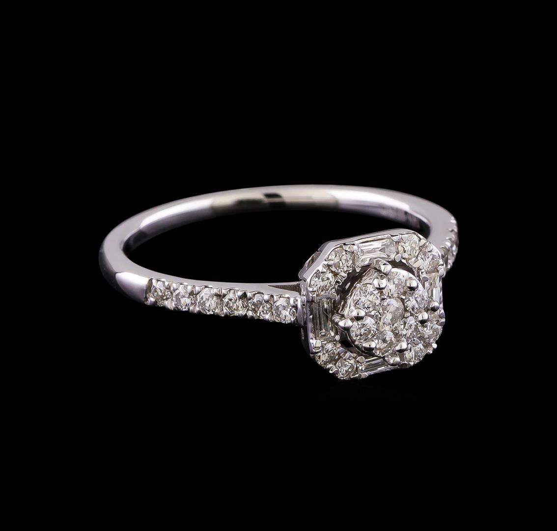 One electronically tested 14KT white gold lady's cast wedding ring with a cathedral halo with a bright polish finish. The featured lady's ring has a shank measuring 1.40 millimeters in width. Identified with markings of '14K'. Condition is new, good workmanship. Containing: One prong set round brilliant cut diamond, measuring 2.30 - 2.25 x 1.41mm (depth est.) approximate weight of 0.05ct. Graded in the setting. Clarity I-1. Color: H Cut Good Twenty-Six prong set round brilliant cut diamonds, measuring 1.60 - 1.50 x 0.96mm (depth est.) approximate total weight of 26 Stones = 0.37ct. Graded in the setting. Clarity SI-1 to SI-2. Color: G - I Cut Good Four prong set baguette cut diamonds, measuring from 2.55 x 1.10 x 0.94mm (depth est.) to 2.60 x 1.20 x 1.02mm (depth est.) approximate total weight of 4 Stones = 0.10ct. Graded in the setting. Clarity VS-2 to SI-2. Color: G - H Cut Good. Total Weight of Diamonds 0.52ct.. Total Weight of Ring 2.90gm. GAS Appraised at $1,875.00.