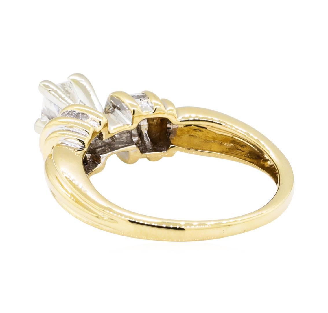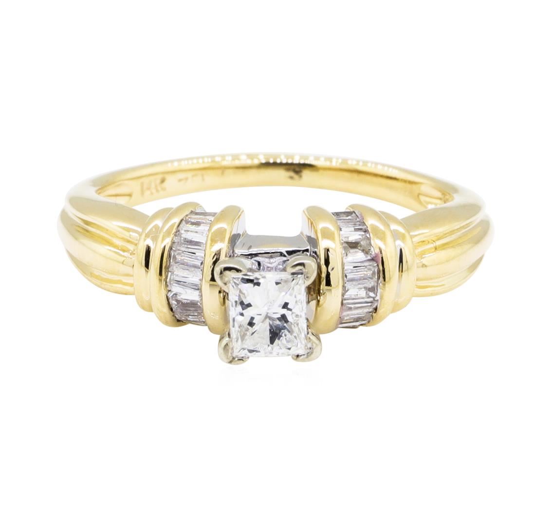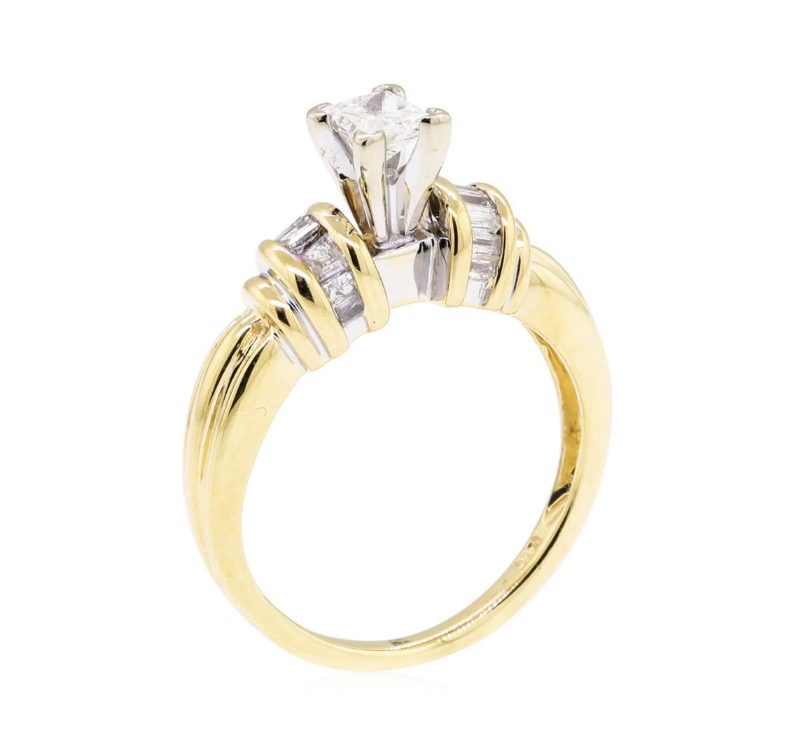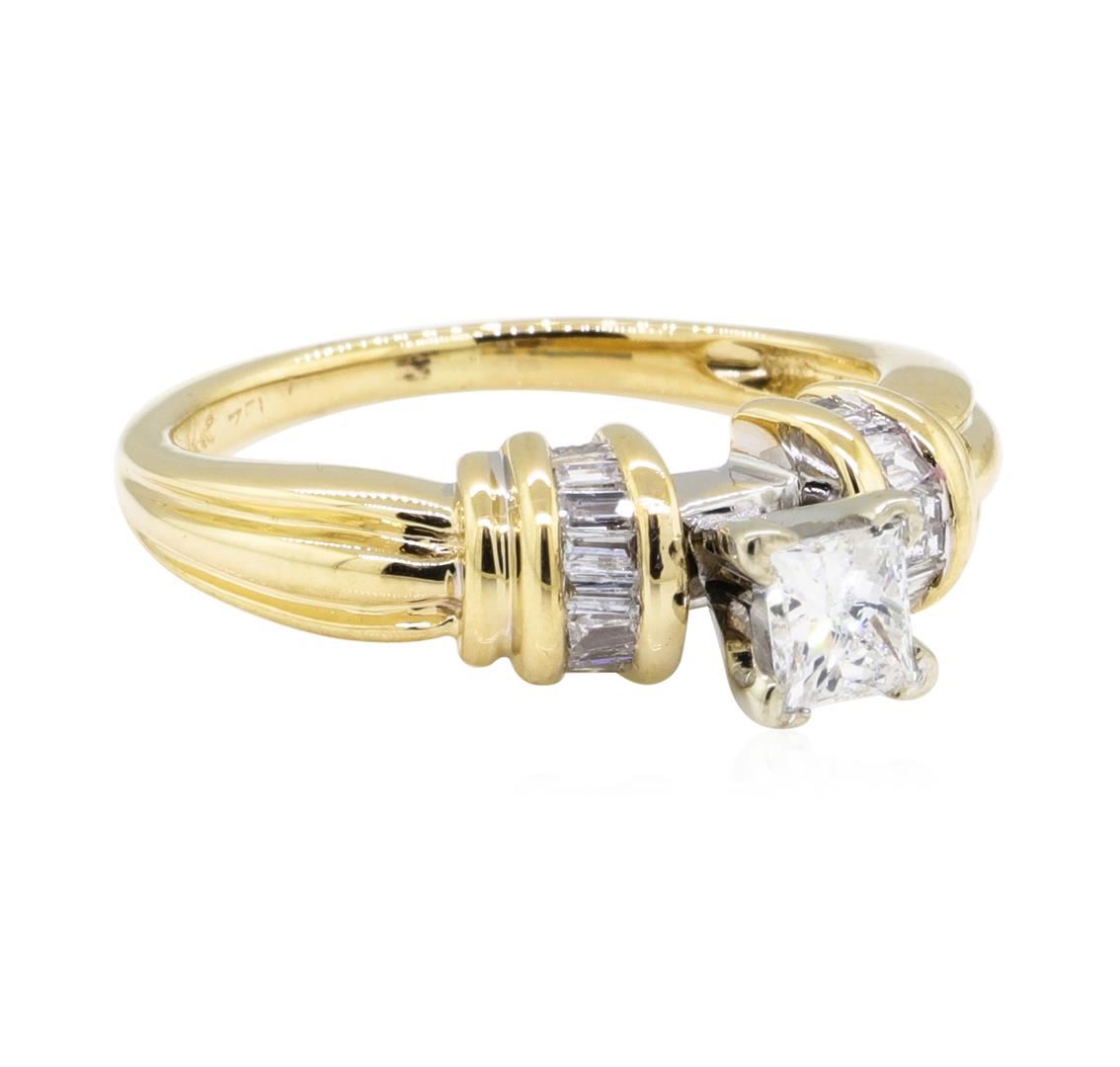 One electronically tested 14KT yellow gold lady's combination cast & assembled wedding ring with a tapered cathedral shank with a bright polish finish. The featured lady's ring has a shank measuring 1.50 millimeters wide. Identified with markings of '14K'. Condition is like new, good workmanship. Containing: One prong set princess cut diamond, measuring 3.85 x 3.42 x 2.57mm (depth est.) approximate weight of 0.28ct. Graded in the setting. Color G - H Clarity I-1 Cut Good Eighteen channel set baguette cut diamonds, measuring from 1.70 x 0.95 x 0.81mm (depth est.) to 1.80 x 1.00 x 0.85mm (depth est.) approximate total weight of 18 Stones = 0.24ct. Graded in the setting. Color G - H Clarity SI-2 to I-1 Cut Good. Total Weight of Diamonds 0.52ct.. Total Weight of Ring 3.50gm GAS Appraised at $1795.00. GAS Appraised at $1,795.00.