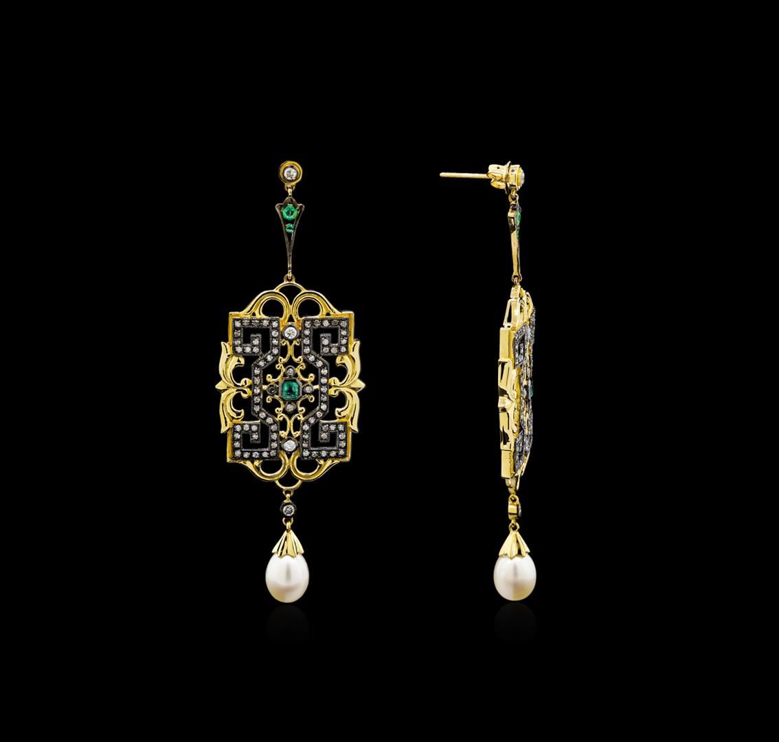 One pair electronically tested 18KT yellow gold lady's combination cast & assembled fashion earrings with friction posts with a bright polish with milgrain detailing finish. Identified with markings of "18K". Condition is new, good workmanship. Containing: Two akoya cultured pearls, 10.5mm in size to 7.3mm in size. The pearls are white in color, rosé overtone with a very good luster, off round, and clean with excellent matching. Two bezel set emerald standard step cut natural emeralds, measuring 3.10 x 3.00 x 1.80mm, 5%. bulge factor, approximate total weight of 0.30ct., clarity is slightly included, type III, medium light, very slightly grayish, green color, (GIA G 4/3), cut is good. Naturally occurring internal & external characteristics are present. Indications of oil residue. Graded in the setting. Two channel set round modified brilliant cut natural emeralds, measuring 2.80 - 2.70 x 1.94 mm, 5%. bulge factor, approximate total weight of 0.20ct., clarity is moderately included, type III, medium light, very slightly grayish, green color, (GIA G 4/3), cut is good. Naturally occurring internal & external characteristics are present. Indications of oil residue. Graded in the setting. Two channel set round modified brilliant cut natural emeralds, measuring 1.50 - 1.40 x 0.94 mm, approximate total weight of 0.02ct., clarity is slightly included, type III, medium light, very slightly grayish, green color, (GIA G 4/3), cut is good. Naturally occurring internal & external characteristics are present. Indications of oil residue. Graded in the setting. Eight bezel set round brilliant cut diamonds, measuring 2.10 - 2.00 x 1.29mm (depth est.) approximate total weight of 8 Stones = 0.27ct. Graded in the setting. Clarity: SI-2 to I-1. Color: G - H. Cut Good One Hundred Fifty-Six prong set single cut diamonds, measuring 1.20 - 1.00 x 0.66mm (depth est.) approximate total weight of 156 Stones = 0.73ct. Graded in the setting. Clarity: SI-1 to I-1. Color: H - I. Cut Good. Total Weight of Colored Stones 0.52ct. Total Weight of Diamonds 1.00ct. Total Weight of Earrings 17.30gm. GAS Appraised at $7,460.00.