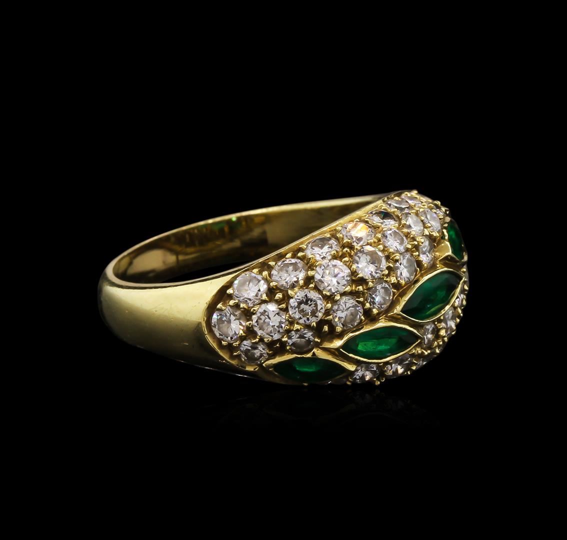 One electronically tested 14KT yellow gold lady's cast dome style ring with a bright polish with milgrain detailing finish. The featured lady's ring has a shank measuring 3.18 millimeters wide. Identified with markings of "585". Condition is used, good workmanship. Containing: One bezel set marquise modified mixed cut natural emerald, measuring 7.00 x 2.80 x 1.82mm, approximate weight of 0.18ct., clarity is slightly included, type III, medium dark, moderately strong, green color, (GIA G 6/4), cut is good. Colored gemstones are presumed to have been subjected to commonly used enhancement processes. Graded in the setting. Two bezel set marquise modified mixed cut natural emeralds, measuring 5.65 x 2.50 x 1.63mm, approximate total weight of 0.24ct., clarity is slightly included, type III, medium dark, moderately strong, green color, (GIA G 6/4), cut is good. Colored gemstones are presumed to have been subjected to commonly used enhancement processes. Graded in the setting. Two bezel set marquise modified mixed cut natural emeralds, measuring 4.00 x 2.00 x 1.30mm, approximate total weight of 0.10ct., clarity is slightly included, type III, medium dark, moderately strong, green color, (GIA G 6/4), cut is good. Colored gemstones are presumed to have been subjected to commonly used enhancement processes. Graded in the setting. Forty-Six pave' set round brilliant cut diamonds, measuring 2.30 - 2.20 x 1.40mm (depth est.) approximate total weight of 46 Stones = 2.00ct. Graded in the setting. Clarity: VS-1 to SI-1. Color: G - Good. Total Weight of Colored Stones 0.52ct. Total Weight of Diamonds 2.00ct. Total Weight of Ring 7.30gm. GAS Appraised at $5,860.00.