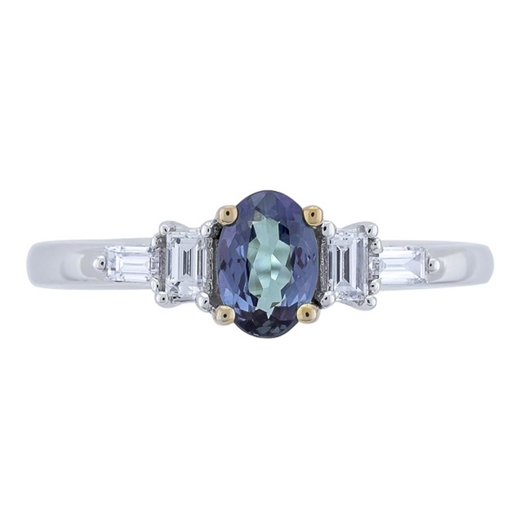 One Alexandrite and Diamond Ring featuring: 18KT White Gold with a total weight of 2.10 grams, Alexandrite with a total weight of 0.53ct and 4 Baguette Cut Diamonds with a total weight of 0.21ctw.