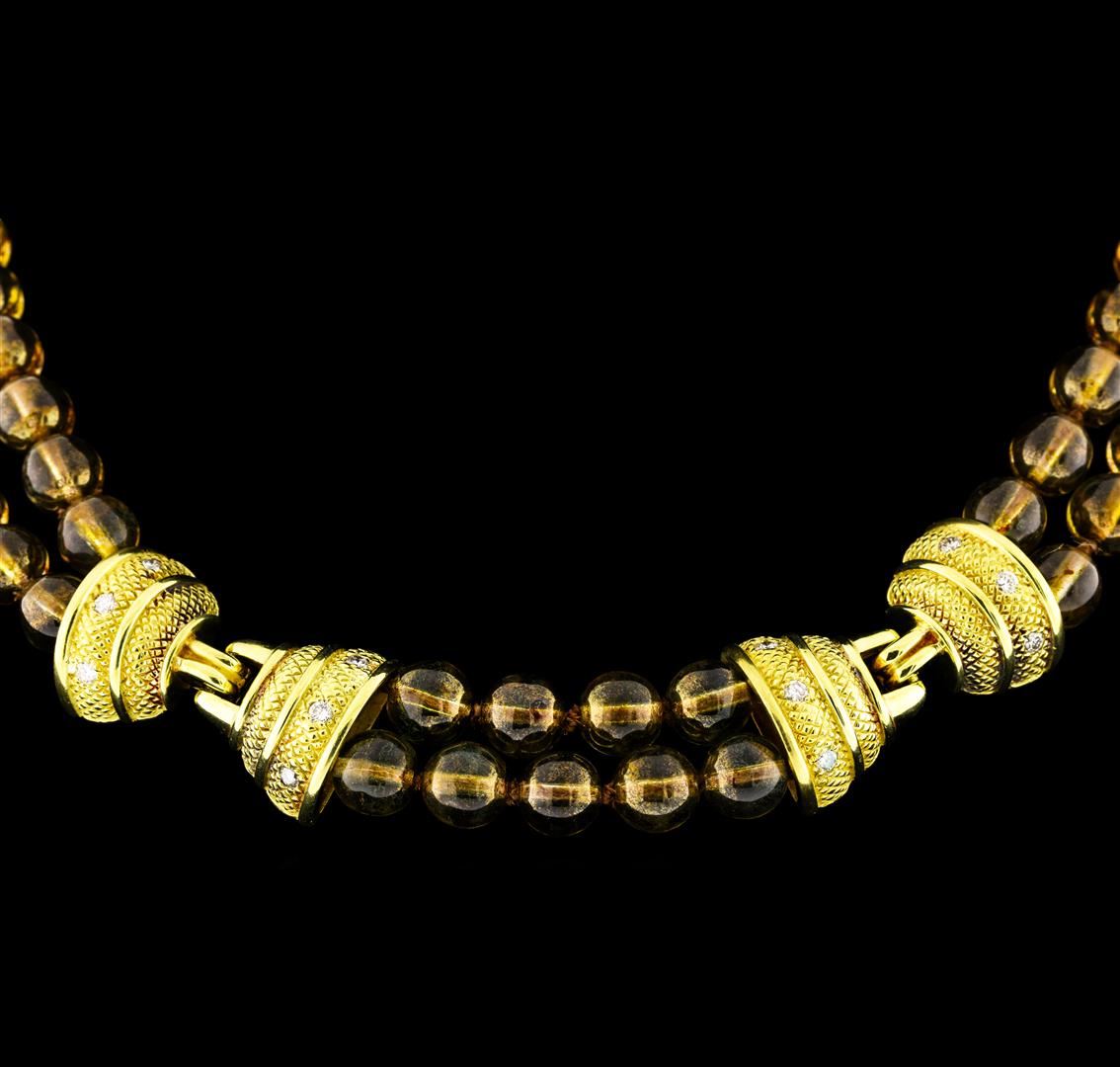 One electronically tested 18KT yellow gold ladies cast & assembled diamond and crystal necklace. Sixteen and one-quarter inch length necklace features double stranded brown crystal beads, terminating in diamond accented hinged snap locking clasps connected by a removable section. Bright and patterned finish. Trademark is Judith Ripka. Identified with markings of '18K'. Condition is good. Containing: Twelve prong set round brilliant cut diamonds, measuring 2.30 - 2.30 x 1.38mm (depth est.) approximate total weight of 12 Stones = 0.53ct. Graded in the setting. Clarity SI-1 to SI-2. Color: G - H One uniform double strand pearl necklace knotted, containing 83 akoya cultured pearls, 7.5mm in size. The pearls are white in color with an excellent luster, round.. Total Weight of Diamonds 0.53ct.. Total Weight of Necklace 82.33gm. AIG Appraised at $4,000.00.