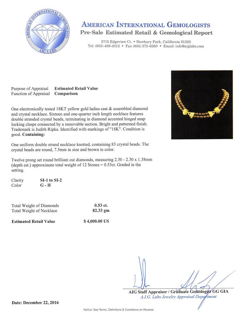 One electronically tested 18KT yellow gold ladies cast & assembled diamond and crystal necklace. Sixteen and one-quarter inch length necklace features double stranded brown crystal beads, terminating in diamond accented hinged snap locking clasps connected by a removable section. Bright and patterned finish. Trademark is Judith Ripka. Identified with markings of '18K'. Condition is good. Containing: Twelve prong set round brilliant cut diamonds, measuring 2.30 - 2.30 x 1.38mm (depth est.) approximate total weight of 12 Stones = 0.53ct. Graded in the setting. Clarity SI-1 to SI-2. Color: G - H One uniform double strand pearl necklace knotted, containing 83 akoya cultured pearls, 7.5mm in size. The pearls are white in color with an excellent luster, round.. Total Weight of Diamonds 0.53ct.. Total Weight of Necklace 82.33gm. AIG Appraised at $4,000.00.