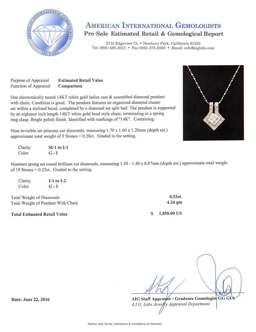 One electronically tested 14KT white gold ladies cast & assembled diamond pendant with chain. The pendant features an organized diamond cluster set within a stylized bezel, completed by a diamond set split bail. The pendant is supported by an eighteen inch length 14KT white gold bead style chain, terminating in a spring ring clasp. Bright polish finish. Identified with markings of "14K". Condition is good. Containing: Nine invisible set princess cut diamonds, measuring 1.70 x 1.60 x 1.20mm (depth est.) approximate total weight of 9 Stones = 0.28ct. Graded in the setting. Clarity: SI-1 to I-1 . Color: G - I Nineteen prong set round brilliant cut diamonds, measuring 1.50 - 1.40 x 0.87mm (depth est.) approximate total weight of 19 Stones = 0.25ct. Graded in the setting. Clarity: I-1 to I-2 . Color: G - I. Total Weight of Diamonds 0.53ct.. Total Weight of Pendant With Chain 4.24gm. AIG Appraised at $1,850.00.