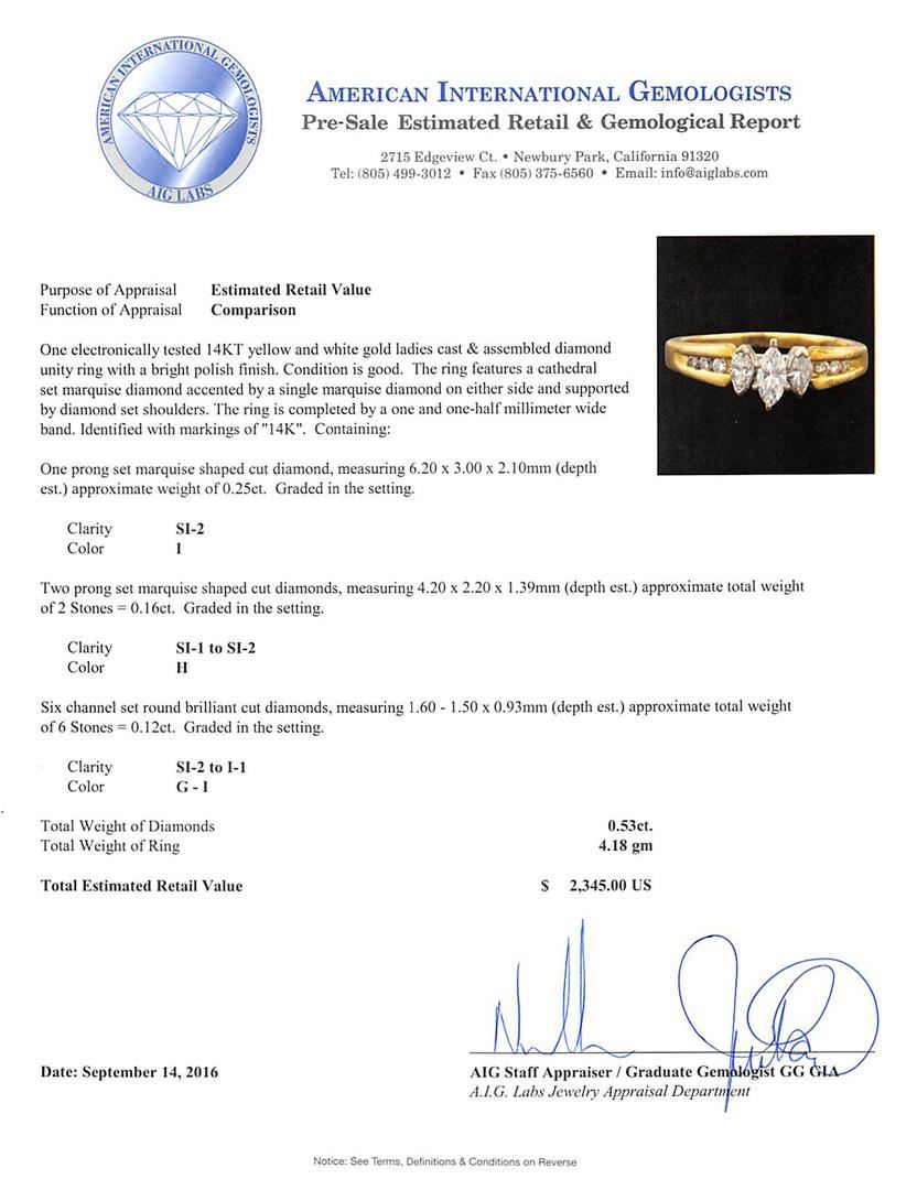 One electronically tested 14KT yellow and white gold ladies cast & assembled diamond unity ring with a bright polish finish. The ring features a cathedral set marquise diamond accented by a single marquise diamond on either side and supported by diamond set shoulders. The ring is completed by a one and one-half millimeter wide band. Identified with markings of '14K'. Condition is good. Containing: One prong set marquise shaped cut diamond, measuring 6.20 x 3.00 x 2.10mm (depth est.) approximate weight of 0.25ct. Graded in the setting. Clarity SI-2. Color: I Two prong set marquise shaped cut diamonds, measuring 4.20 x 2.20 x 1.39mm (depth est.) approximate total weight of 2 Stones = 0.16ct. Graded in the setting. Clarity SI-1 to SI-2. Color: H Six channel set round brilliant cut diamonds, measuring 1.60 - 1.50 x 0.93mm (depth est.) approximate total weight of 6 Stones = 0.12ct. Graded in the setting. Clarity SI-2 to I-1. Color: G - I. Total Weight of Diamonds 0.53ct.. Total Weight of Ring 4.18gm. AIG Appraised at $2,345.00.