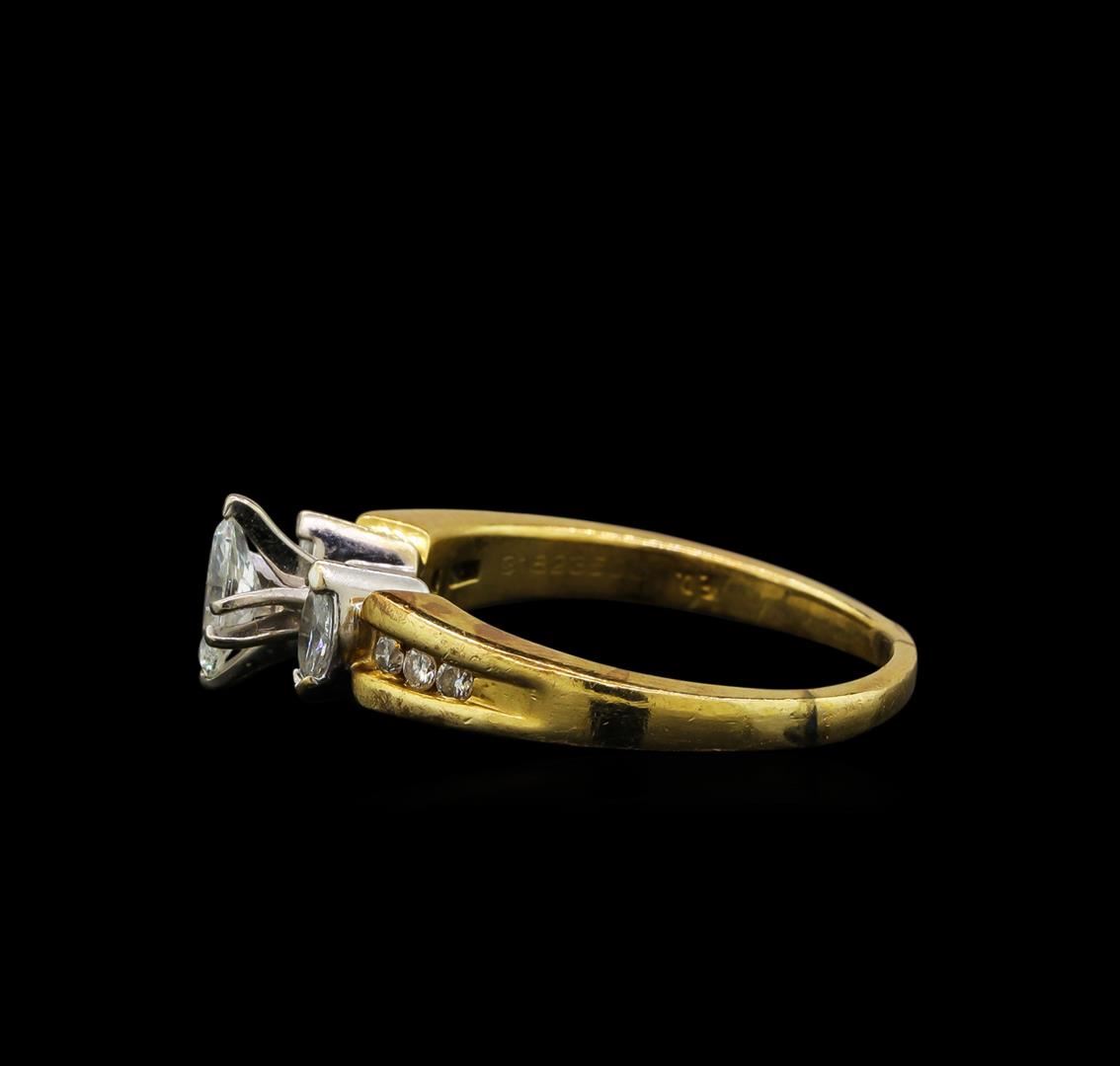 One electronically tested 14KT yellow and white gold ladies cast & assembled diamond unity ring with a bright polish finish. The ring features a cathedral set marquise diamond accented by a single marquise diamond on either side and supported by diamond set shoulders. The ring is completed by a one and one-half millimeter wide band. Identified with markings of '14K'. Condition is good. Containing: One prong set marquise shaped cut diamond, measuring 6.20 x 3.00 x 2.10mm (depth est.) approximate weight of 0.25ct. Graded in the setting. Clarity SI-2. Color: I Two prong set marquise shaped cut diamonds, measuring 4.20 x 2.20 x 1.39mm (depth est.) approximate total weight of 2 Stones = 0.16ct. Graded in the setting. Clarity SI-1 to SI-2. Color: H Six channel set round brilliant cut diamonds, measuring 1.60 - 1.50 x 0.93mm (depth est.) approximate total weight of 6 Stones = 0.12ct. Graded in the setting. Clarity SI-2 to I-1. Color: G - I. Total Weight of Diamonds 0.53ct.. Total Weight of Ring 4.18gm. AIG Appraised.