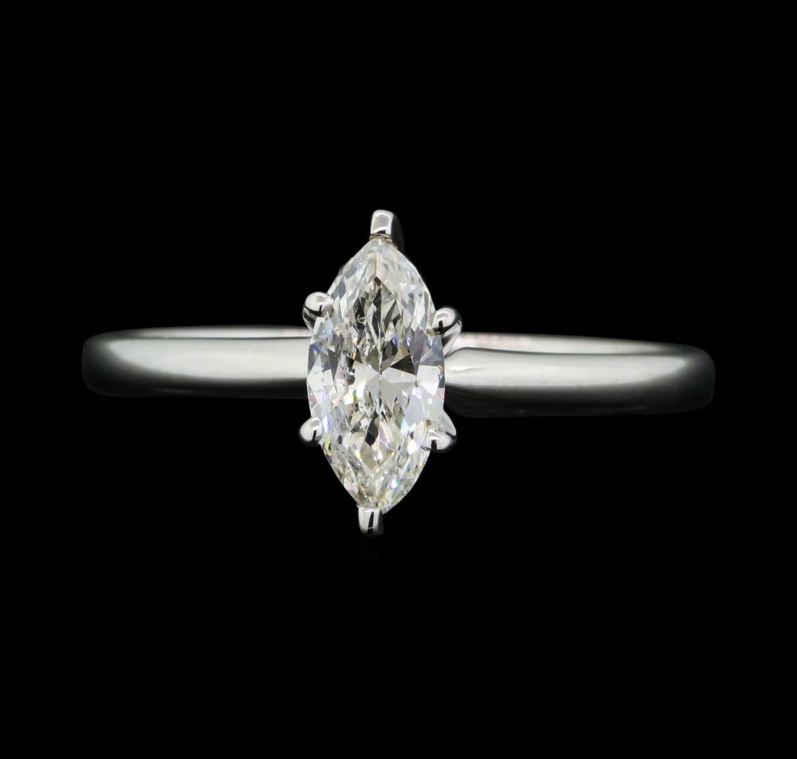 One electronically tested 14KT white gold lady's cast fashion solitaire wedding ring with a bright polish finish. The featured lady's ring has a shank measuring 1.77 millimeters wide. Identified with markings of '14KP'. Condition is new, good workmanship. Containing: One prong set marquise shaped cut diamond, measuring 8.20 x 4.05 x 2.55mm (depth est.) approximate weight of 0.53ct. Graded in the setting. Clarity SI-2. Color: I Cut Very Good. Total Weight of Diamonds 0.53ct.. Total Weight of Wedding Ring 2.00gm GAS Appraised at $2,710.00.