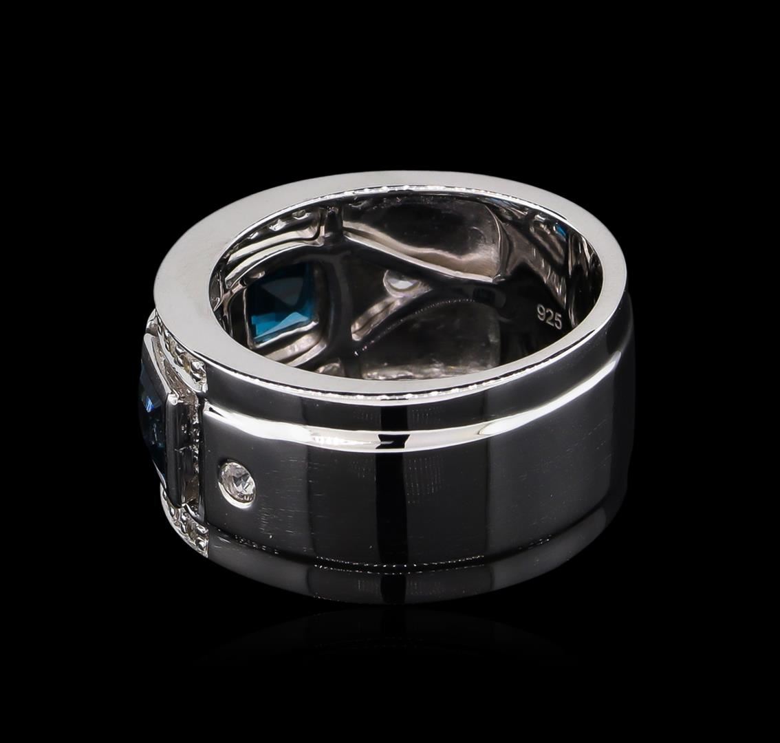 From the brand whose products have inspired creative expression for more than 110 years comes this beautiful ring by Crayola. This stunning piece of jewelry reflects the image and colorful personality of the Crayola brand. The ring features .925 Silver With Rhodium weighing 6.3 grams containing 9mm Pipe Cut Ring Midnight Blue London Blue Topaz (AAA) Square 4.00mm - 2Pcs + Natural White Sapphire Square (AAA) 4.00mm - 1 pc + Natural White Sapphire Round 2.00mm - 2Pcs + Natural White Sapphire Round 1.20mm - 24Pcs ( With J BACK ). Total Blue Topaz weight is 0.54. Total white sapphire weight is approximately 0.66.