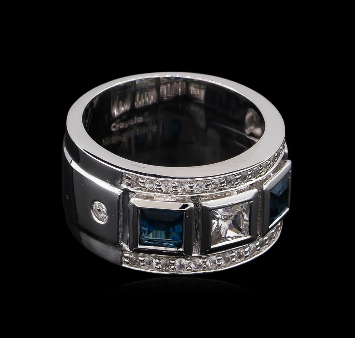 From the brand whose products have inspired creative expression for more than 110 years comes this beautiful ring by Crayola. This stunning piece of jewelry reflects the image and colorful personality of the Crayola brand. The ring features .925 Silver With Rhodium weighing 6.3 grams containing 9mm Pipe Cut Ring Midnight Blue London Blue Topaz (AAA) Square 4.00mm - 2Pcs + Natural White Sapphire Square (AAA) 4.00mm - 1 pc + Natural White Sapphire Round 2.00mm - 2Pcs + Natural White Sapphire Round 1.20mm - 24Pcs ( With J BACK ). Total Blue Topaz weight is 0.54. Total white sapphire weight is approximately 0.66.