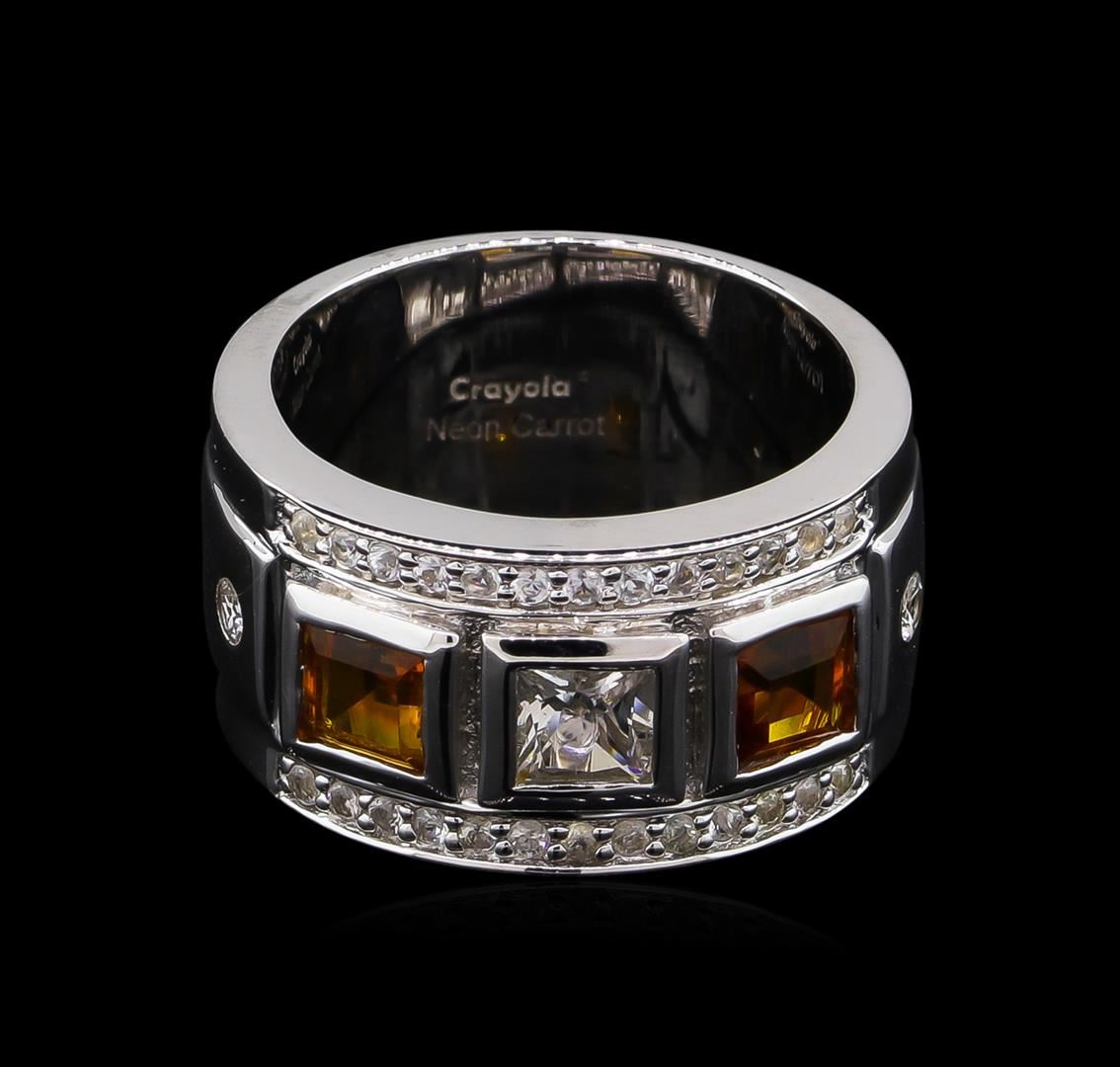 From the brand whose products have inspired creative expression for more than 110 years comes this beautiful ring by Crayola. This stunning piece of jewelry reflects the image and colorful personality of the Crayola brand. The ring features .925 Silver With Rhodium weighing 6.3 grams containing 9mm Pipe Cut Ring Neon Carrot Citrine (AAA) Square 4.00mm - 2Pcs + Natural White Sapphire Square (AAA) 4.00mm - 1 pc + Natural White Sapphire Round 2.00mm - 2Pcs + Natural White Sapphire Round 1.20mm - 24Pcs ( With J BACK ). Total Citrine weight is 0.54. Total white sapphire weight is approximately 0.66.
