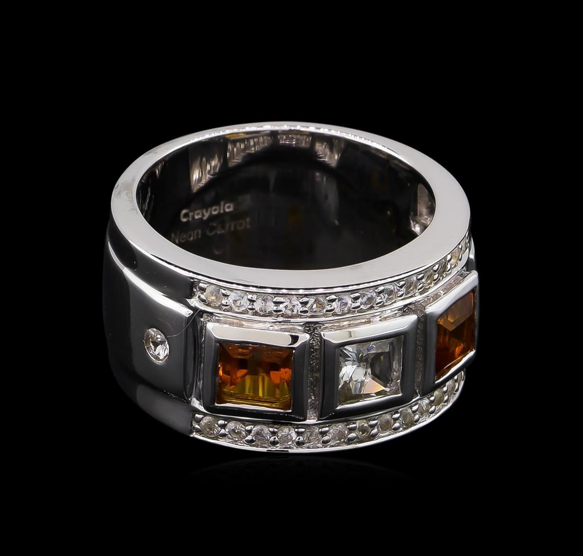 From the brand whose products have inspired creative expression for more than 110 years comes this beautiful ring by Crayola. This stunning piece of jewelry reflects the image and colorful personality of the Crayola brand. The ring features .925 Silver With Rhodium weighing 6.3 grams containing 9mm Pipe Cut Ring Neon Carrot Citrine (AAA) Square 4.00mm - 2Pcs + Natural White Sapphire Square (AAA) 4.00mm - 1 pc + Natural White Sapphire Round 2.00mm - 2Pcs + Natural White Sapphire Round 1.20mm - 24Pcs ( With J BACK ). Total Citrine weight is 0.54. Total white sapphire weight is approximately 0.66.