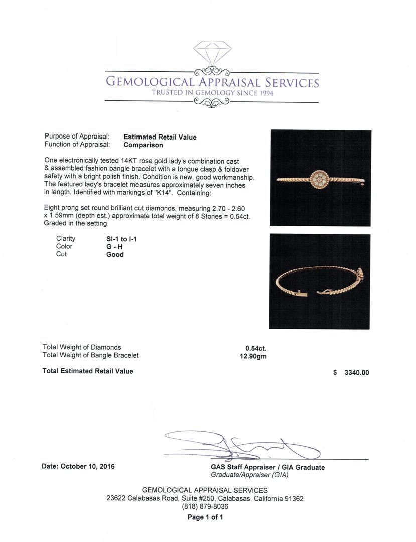 One electronically tested 14KT rose gold lady's combination cast & assembled fashion bangle bracelet with a tongue clasp & foldover safety with a bright polish finish. The featured lady's bracelet measures approximately seven inches in length. Identified with markings of 'K14'. Condition is new, good workmanship. Containing: Eight prong set round brilliant cut diamonds, measuring 2.70 - 2.60 x 1.59mm (depth est.) approximate total weight of 8 Stones = 0.54ct. Graded in the setting. Clarity SI-1 to I-1. Color: G - H Cut Good. Total Weight of Diamonds 0.54ct.. Total Weight of Bangle Bracelet 12.90gm. GAS Appraised at $3,340.00.