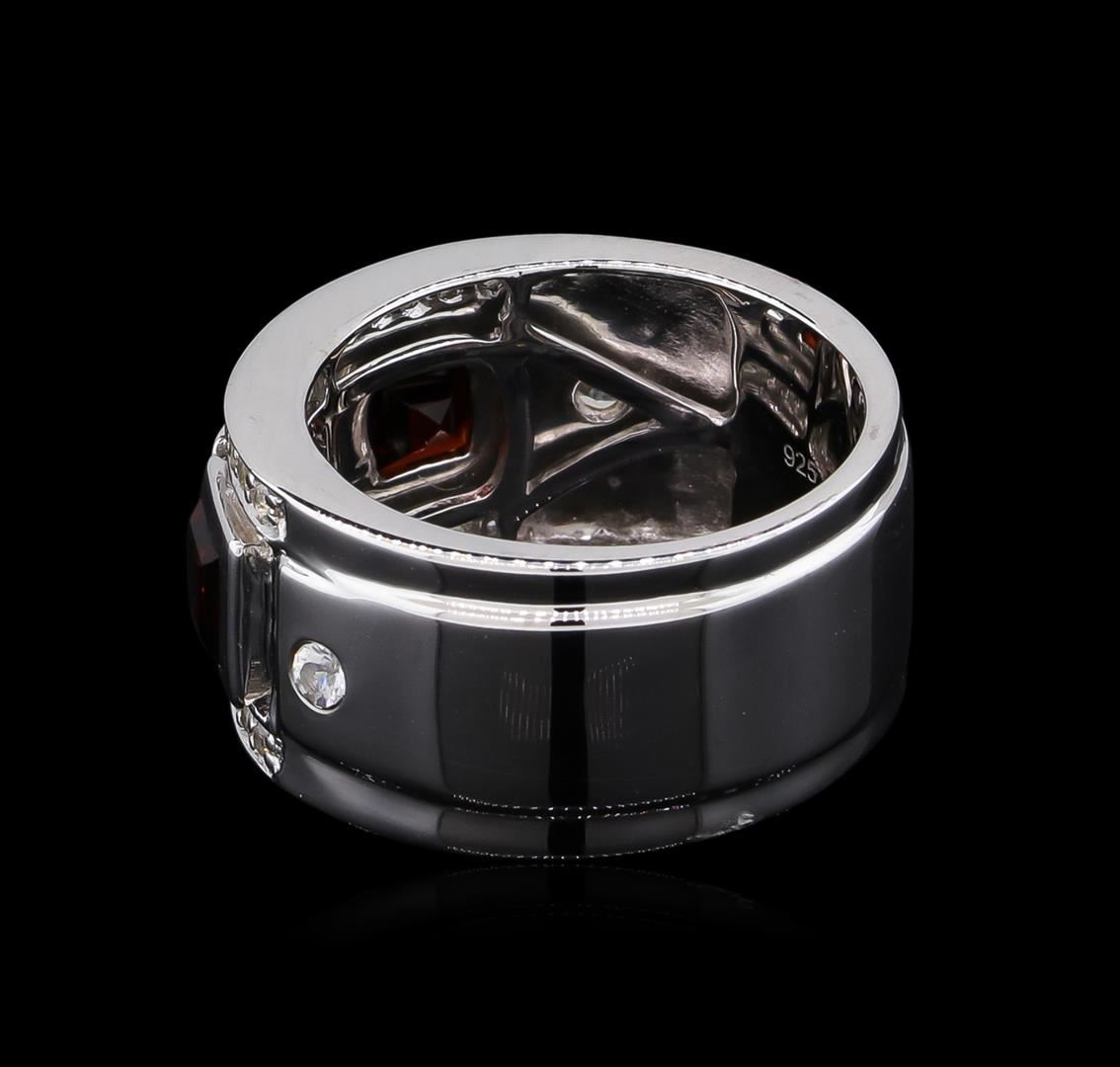 From the brand whose products have inspired creative expression for more than 110 years comes this beautiful ring by Crayola. This stunning piece of jewelry reflects the image and colorful personality of the Crayola brand. The ring features .925 Silver With Rhodium weighing 6.3 grams containing 9mm Pipe Cut Ring Maroon Garnet (AAA) Square 4.00mm - 2Pcs + Natural White Sapphire Square (AAA) 4.00mm - 1 pc + Natural White Sapphire Round 2.00mm - 2Pcs + Natural White Sapphire Round 1.20mm - 24Pcs ( With J BACK ). Total Garnet weight is 0.54. Total white sapphire weight is approximately 0.66.