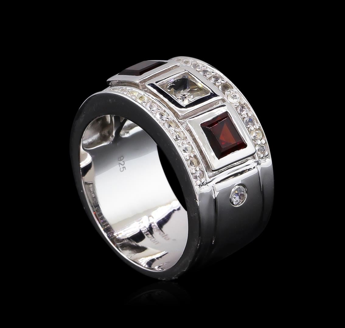 From the brand whose products have inspired creative expression for more than 110 years comes this beautiful ring by Crayola. This stunning piece of jewelry reflects the image and colorful personality of the Crayola brand. The ring features .925 Silver With Rhodium weighing 6.3 grams containing 9mm Pipe Cut Ring Maroon Garnet (AAA) Square 4.00mm - 2Pcs + Natural White Sapphire Square (AAA) 4.00mm - 1 pc + Natural White Sapphire Round 2.00mm - 2Pcs + Natural White Sapphire Round 1.20mm - 24Pcs ( With J BACK ). Total Garnet weight is 0.54. Total white sapphire weight is approximately 0.66.