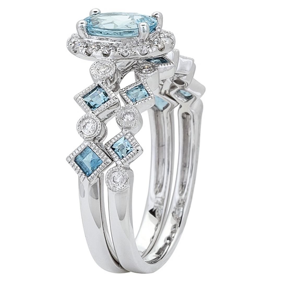 One Aquamarine and Diamond Ring featuring: 14KT White Gold with a total weight of 4.01 grams, Aquamarine with a total weight of 0.55ct, 9 Aquamarine Stones with a total weight of 0.37ctw, and 26 Round Cut Diamonds with a total weight of 0.22ctw.