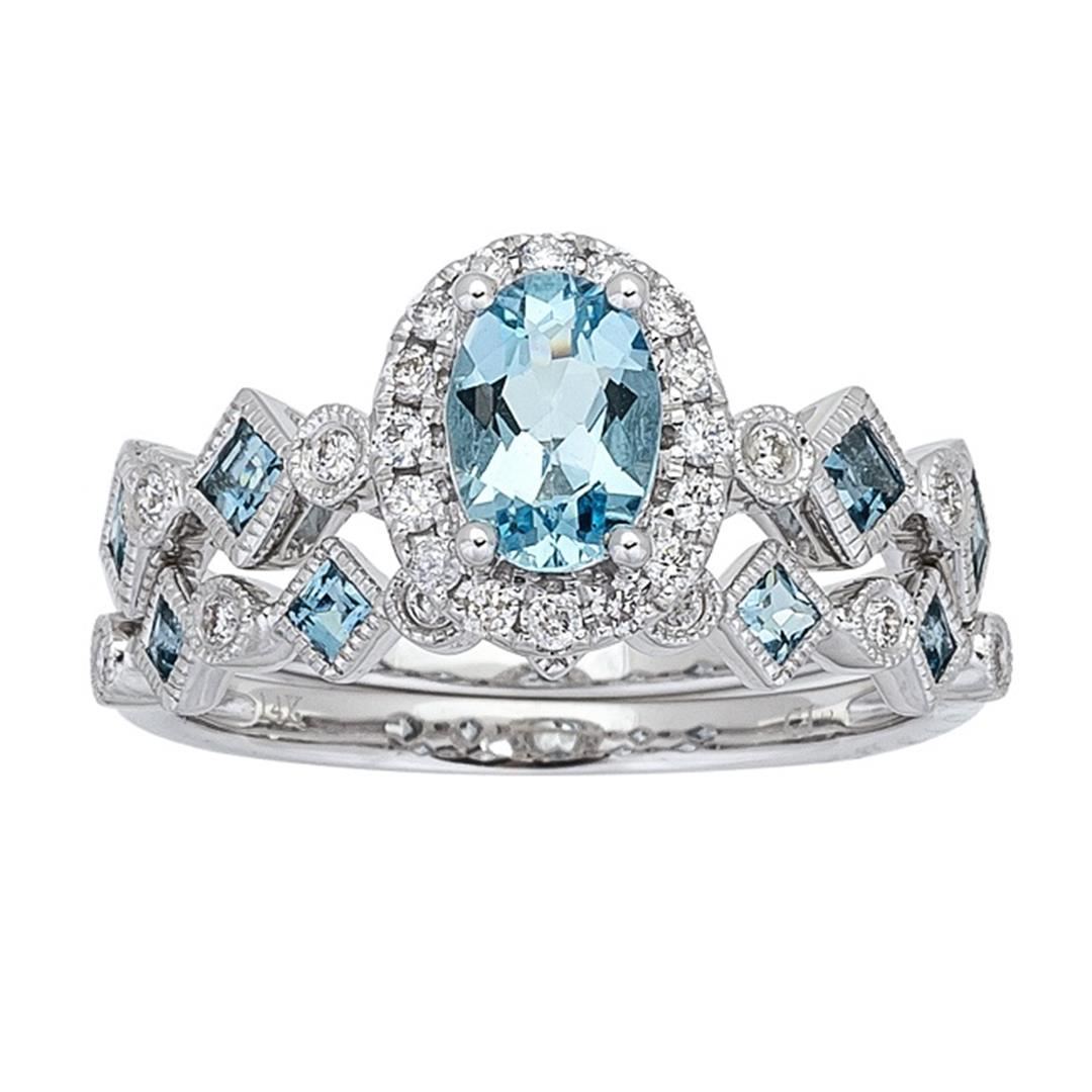 One Aquamarine and Diamond Ring featuring: 14KT White Gold with a total weight of 4.01 grams, Aquamarine with a total weight of 0.55ct, 9 Aquamarine Stones with a total weight of 0.37ctw, and 26 Round Cut Diamonds with a total weight of 0.22ctw.