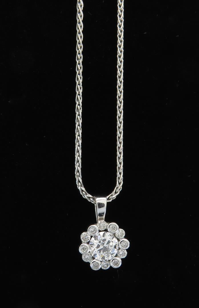 One tested 14K white gold diamond pendant. Containing: One Round Brilliant Cut Diamond. Approximate Size: .40CT, Clarity: I, Color: F-G. Approximate total diamond weight: .55CTW. All diamonds are graded in the mounting unless otherwise stated. Weight of necklace: 4.0 grams. Size of chain: 20".