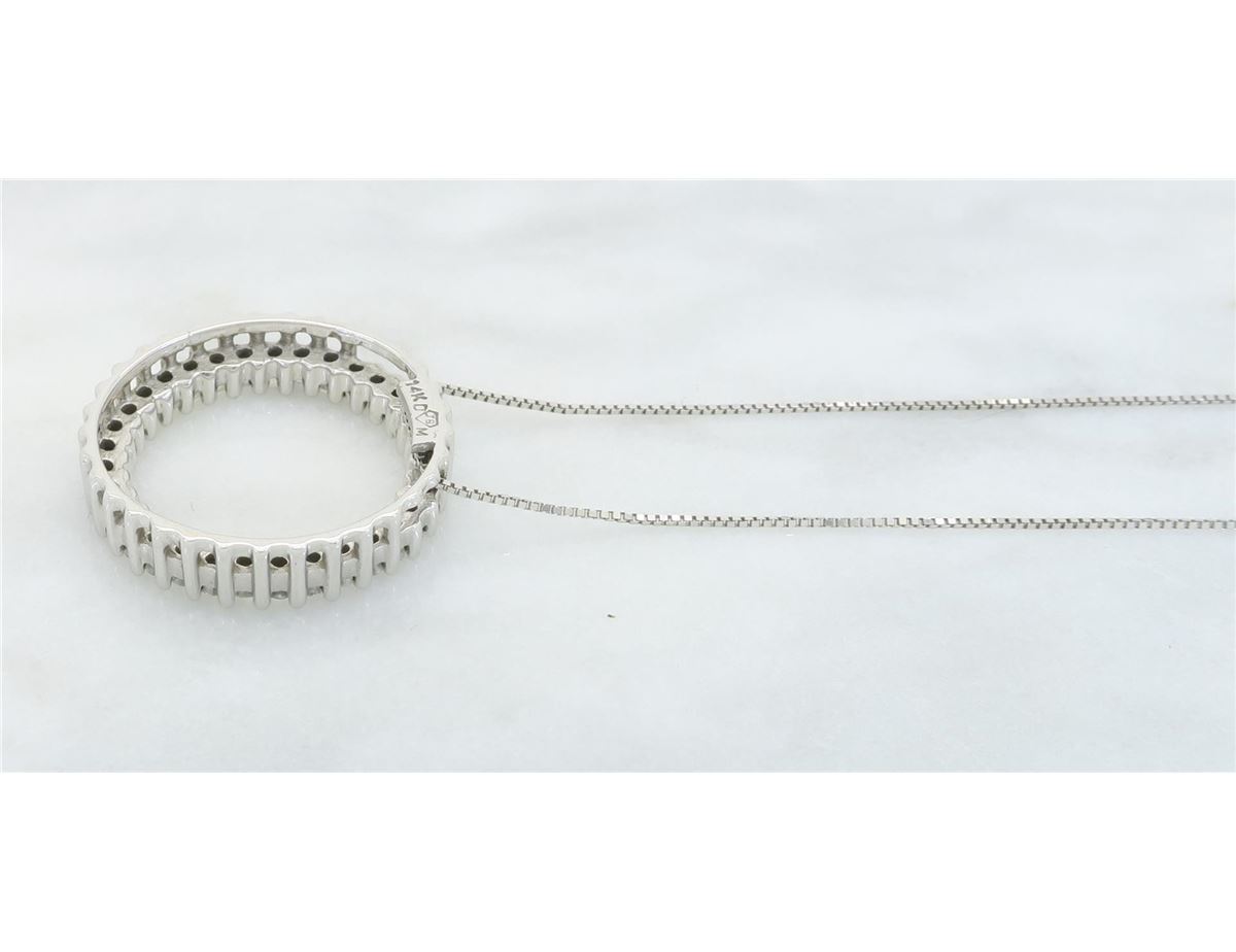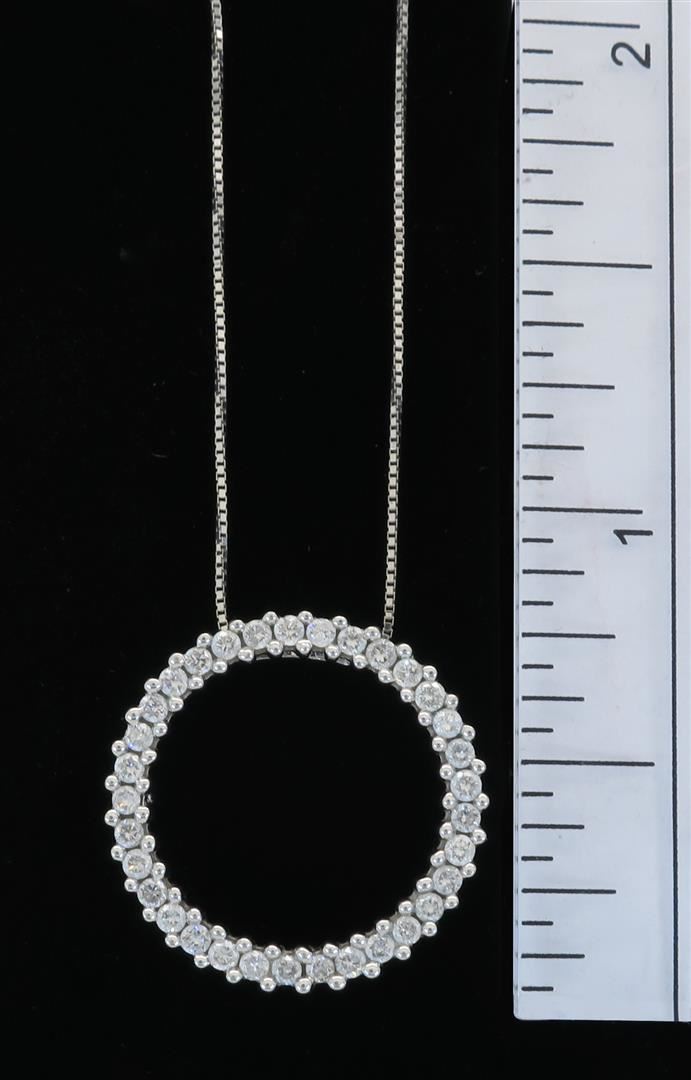 One tested 14K white gold diamond pendant. Containing: 33 Round Brilliant Cut Diamonds. Clarity: SI1-I1, Color: G-H. Approximate total diamond weight: .55CTW. All diamonds are graded in the mounting unless otherwise stated. Weight of necklace: 3.9 grams, Size of chain: 18" long