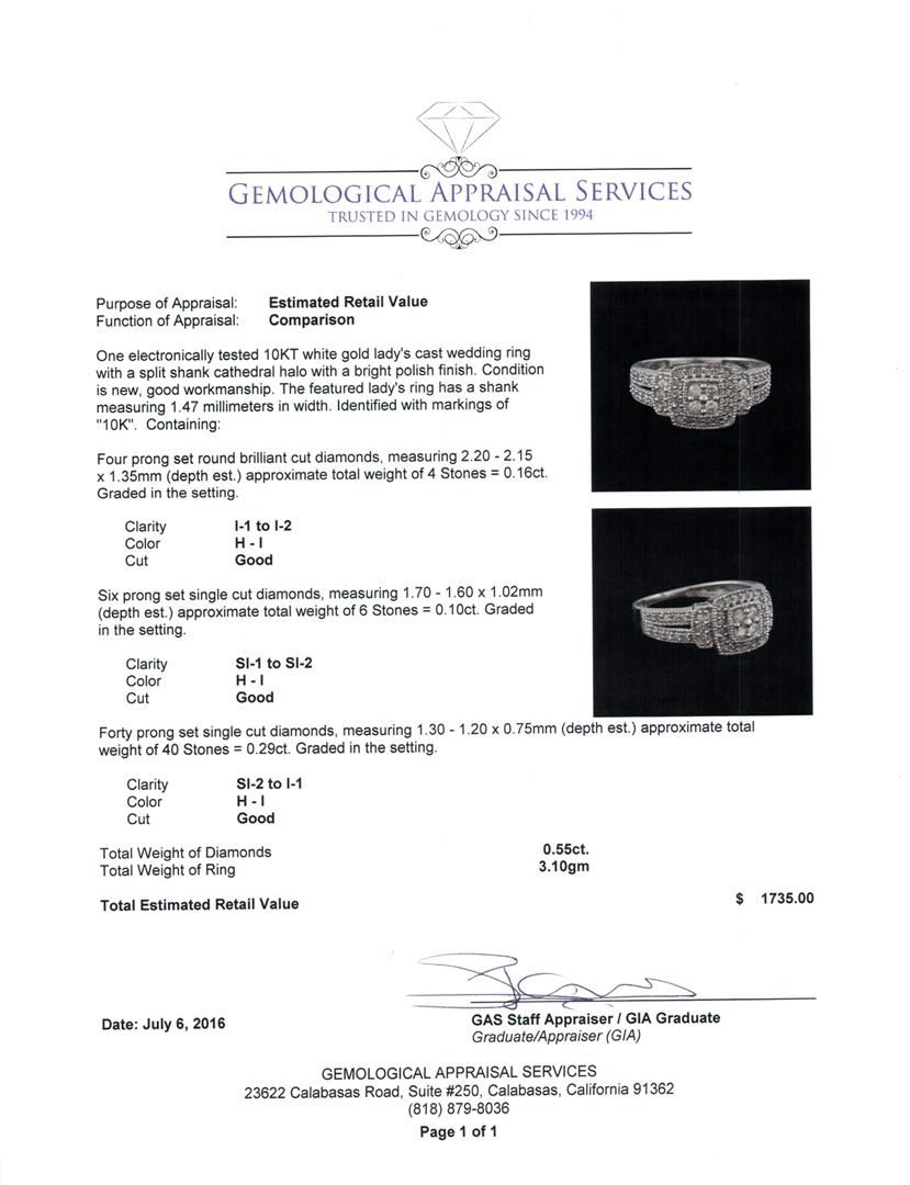 One electronically tested 10KT white gold lady's cast wedding ring with a split shank cathedral halo with a bright polish finish. The featured lady's ring has a shank measuring 1.47 millimeters in width. Identified with markings of '10K'. Condition is new, good workmanship. Containing: Four prong set round brilliant cut diamonds, measuring 2.20 - 2.15 x 1.35mm (depth est.) approximate total weight of 4 Stones = 0.16ct. Graded in the setting. Clarity I-1 to I-2. Color: H - I Cut Good Six prong set single cut diamonds, measuring 1.70 - 1.60 x 1.02mm (depth est.) approximate total weight of 6 Stones = 0.10ct. Graded in the setting. Clarity SI-1 to SI-2. Color: H - I Cut Good Forty prong set single cut diamonds, measuring 1.30 - 1.20 x 0.75mm (depth est.) approximate total weight of 40 Stones = 0.29ct. Graded in the setting. Clarity SI-2 to I-1. Color: H - I Cut Good. Total Weight of Diamonds 0.55ct.. Total Weight of Ring 3.10gm. GAS Appraised at $1,735.00.