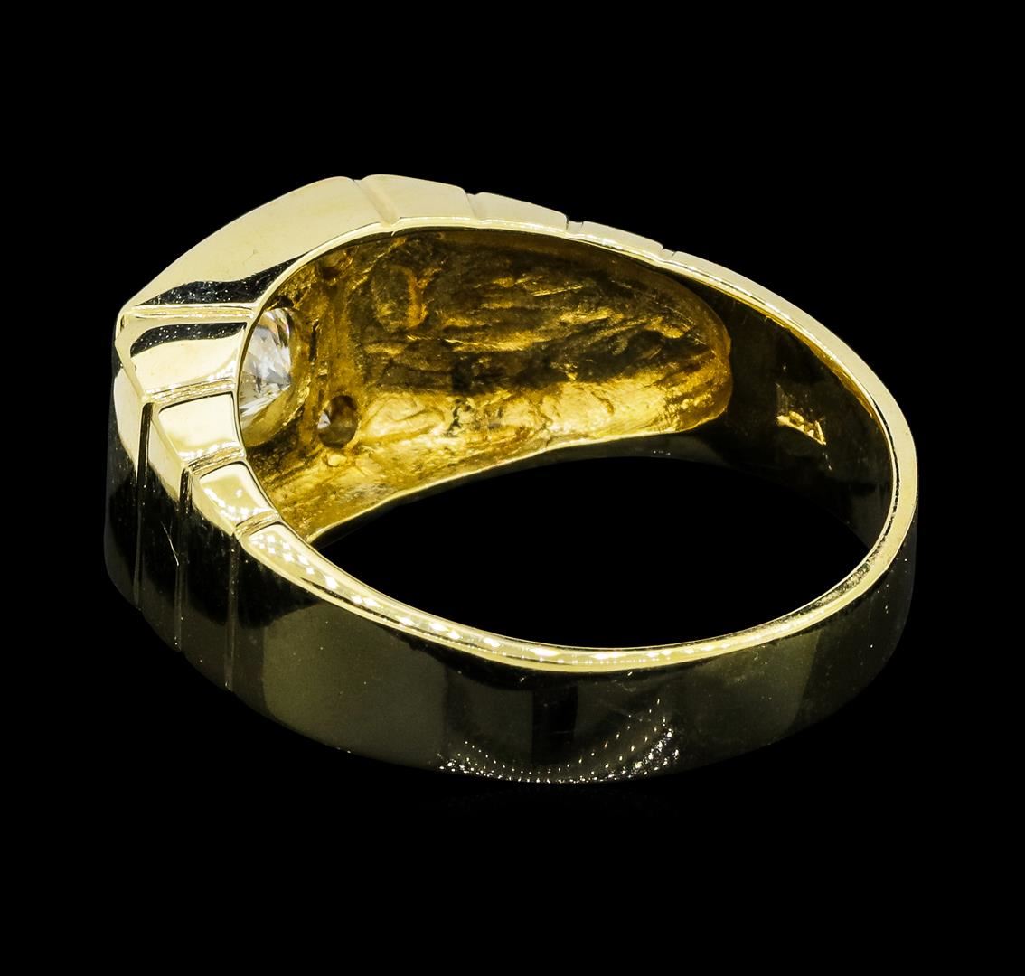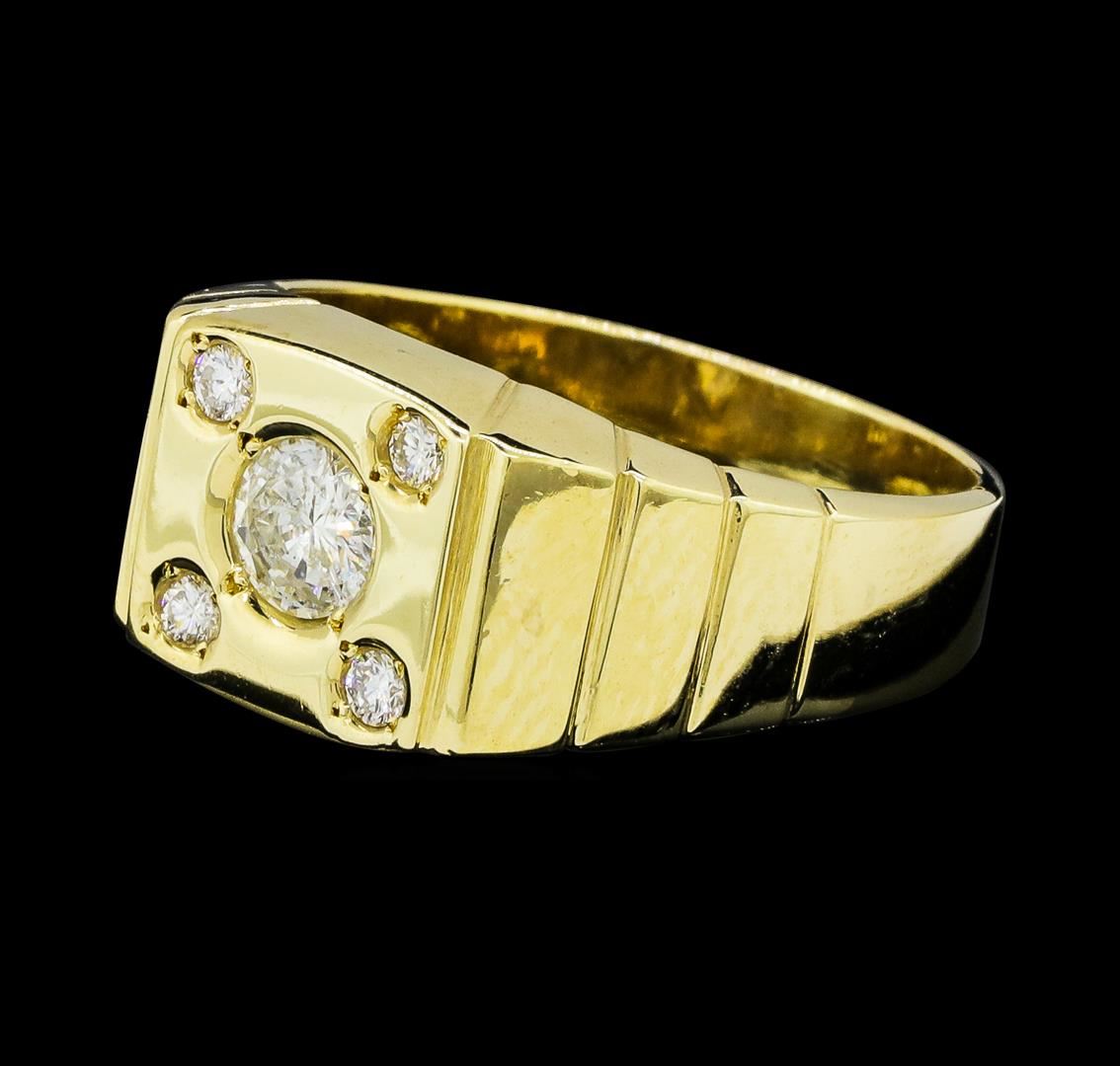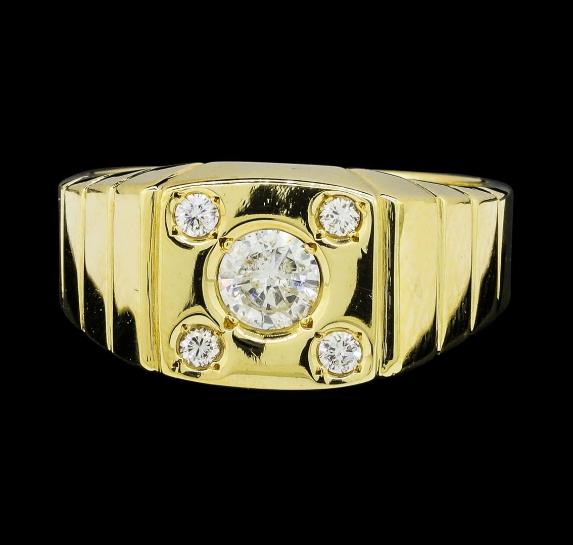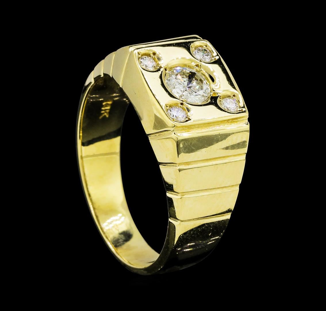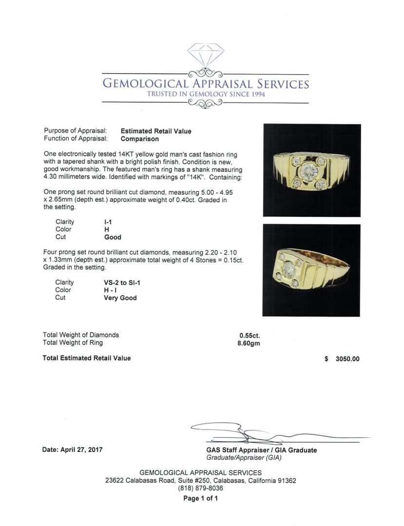 One electronically tested 14KT yellow gold man's cast fashion ring with a tapered shank with a bright polish finish. The featured man's ring has a shank measuring 4.30 millimeters wide. Identified with markings of '14K'. Condition is new, good workmanship. Containing: One prong set round brilliant cut diamond, measuring 5.00 - 4.95 x 2.65mm (depth est.) approximate weight of 0.40ct. Graded in the setting. Color H Clarity I-1 Cut Good Four prong set round brilliant cut diamonds, measuring 2.20 - 2.10 x 1.33mm (depth est.) approximate total weight of 4 Stones = 0.15ct. Graded in the setting. Color H - I Clarity VS-2 to SI-1 Cut Very Good. Total Weight of Diamonds 0.55ct.. Total Weight of Ring 8.60gm GAS Appraised at $3050.00. GAS Appraised at $3,050.00.