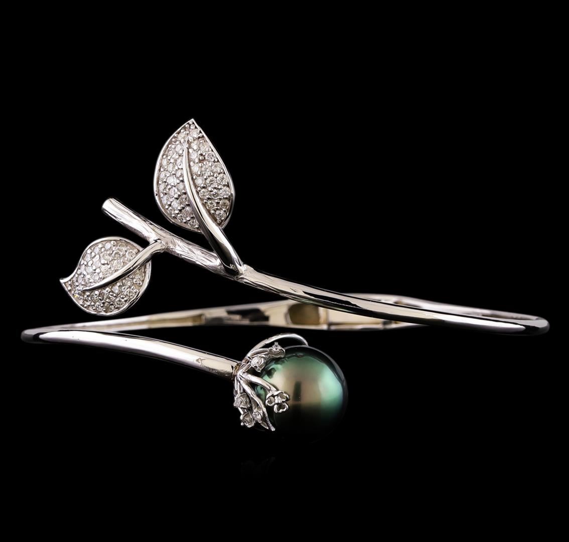 One electronically tested 14KT white gold lady's combination cast & assembled fashion cuff bracelet with a bright polish finish. The featured lady's bracelet has a botanical motif and measures seven inches in length. Identified with markings of 'K14'. Condition is new, good workmanship. Containing: One Tahitian pearl, 11.5mm to 11.3mm in size. The pearl is black in color, green overtone with a very good luster, round to near round, and mostly clean. Graded in the setting. Sixty-Eight prong set round brilliant cut diamonds, measuring 1.30 - 1.25 x 0.79mm (depth est.) approximate total weight of 68 Stones = 0.55ct. Graded in the setting. Clarity SI-1 to SI-2. Color: G - I Cut Good. Total Weight of Diamonds 0.55ct.. Total Weight of Bracelet 13.70gm. GAS Appraised at $5,365.00.